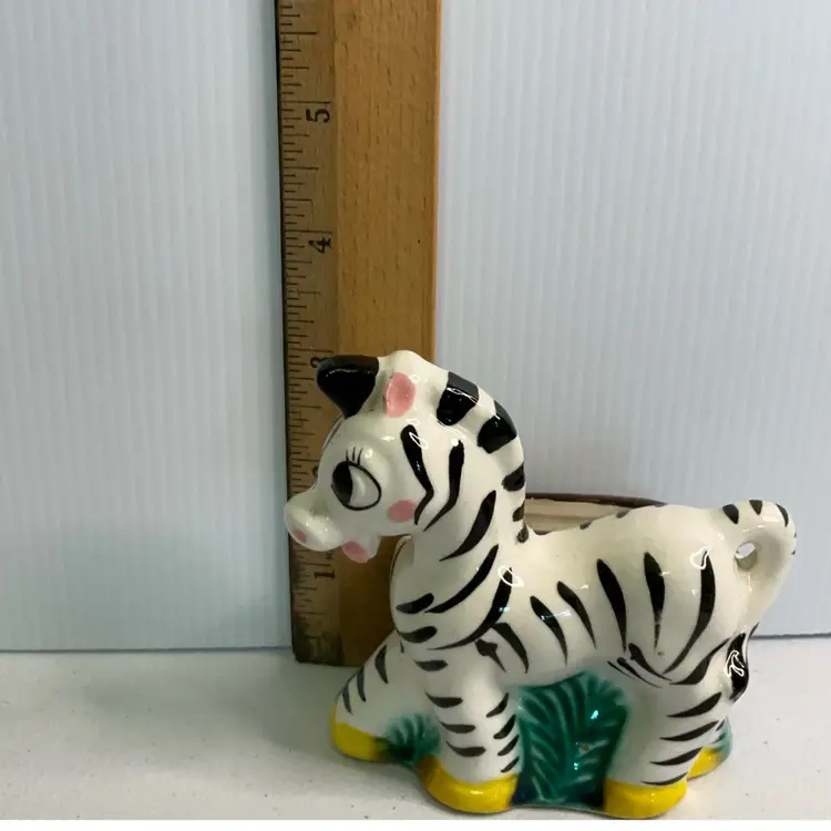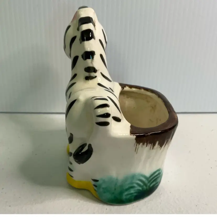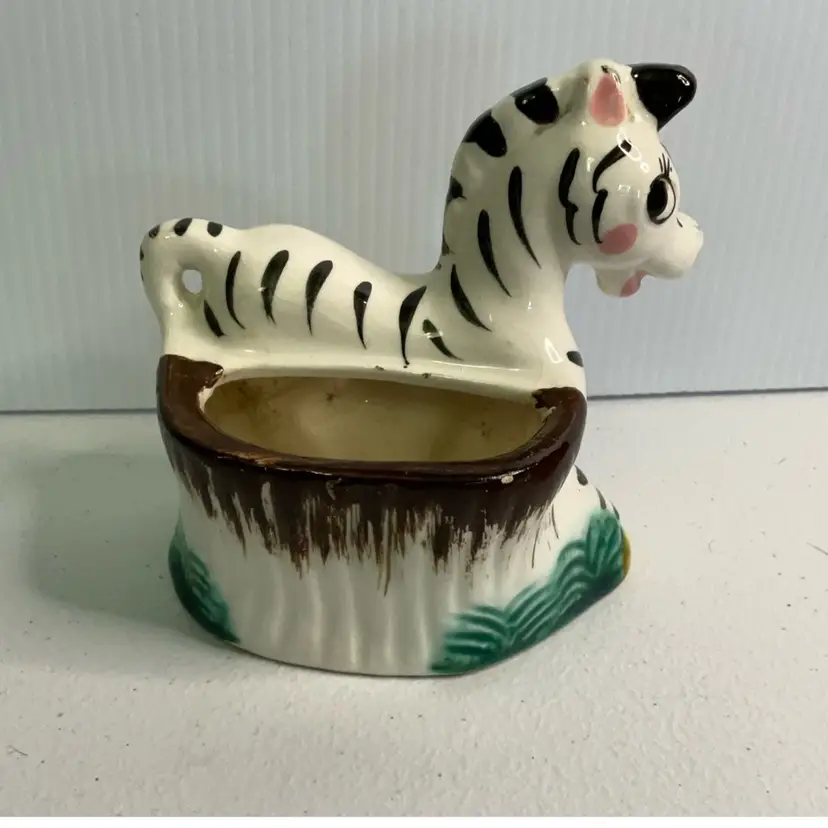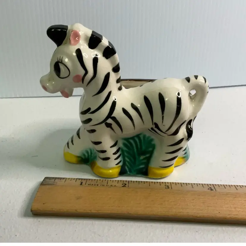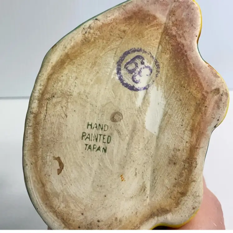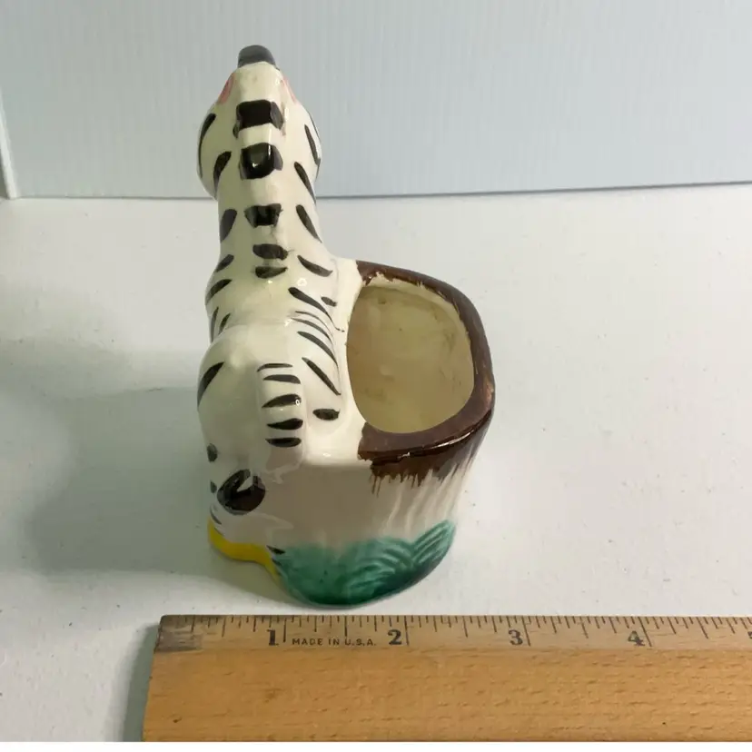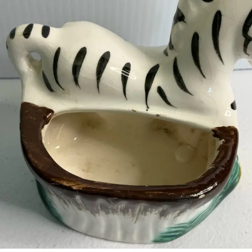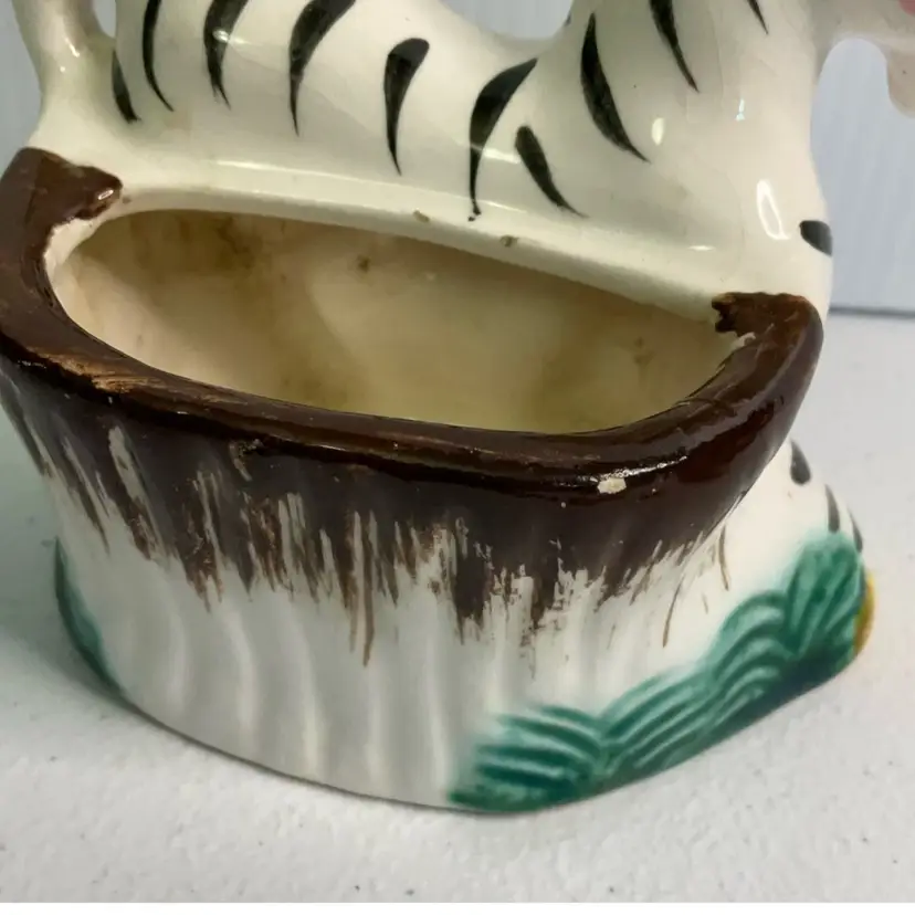 As shown. Small chip to back rim. 3 inches tall, 3.5 inches long, and 2.5 inches wide