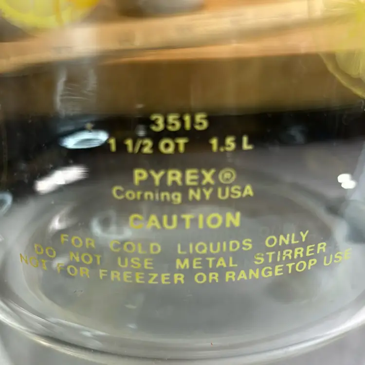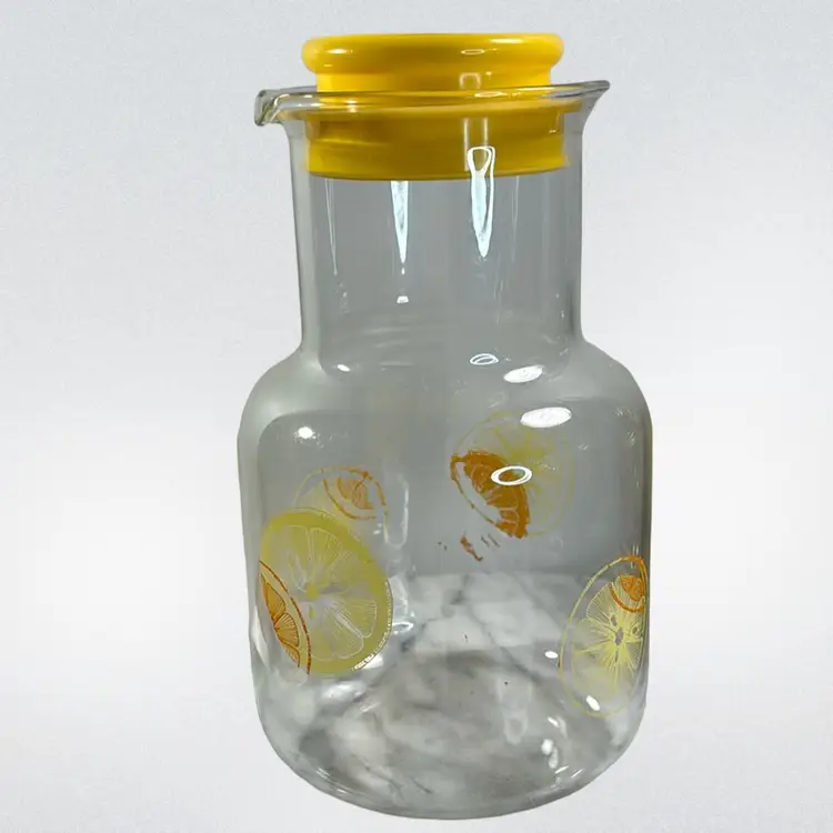 Good condition with some missing painted oranges. Measures 9" tall by 4.75" wide, with 1.5 quart capacity.