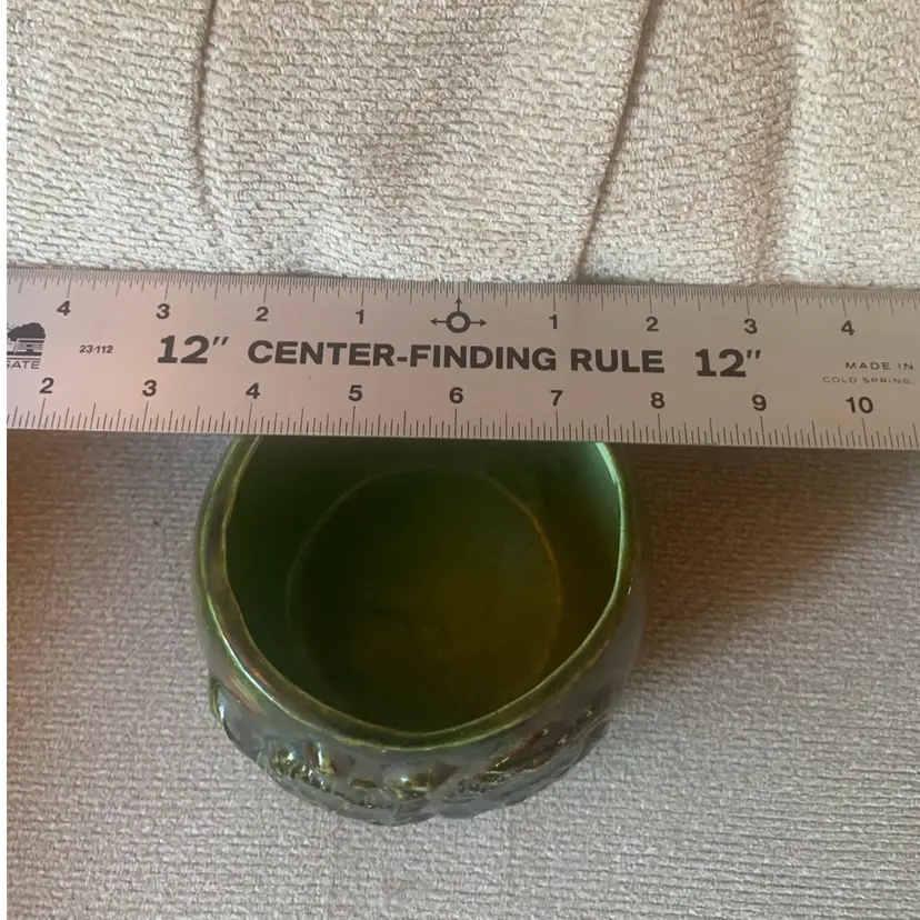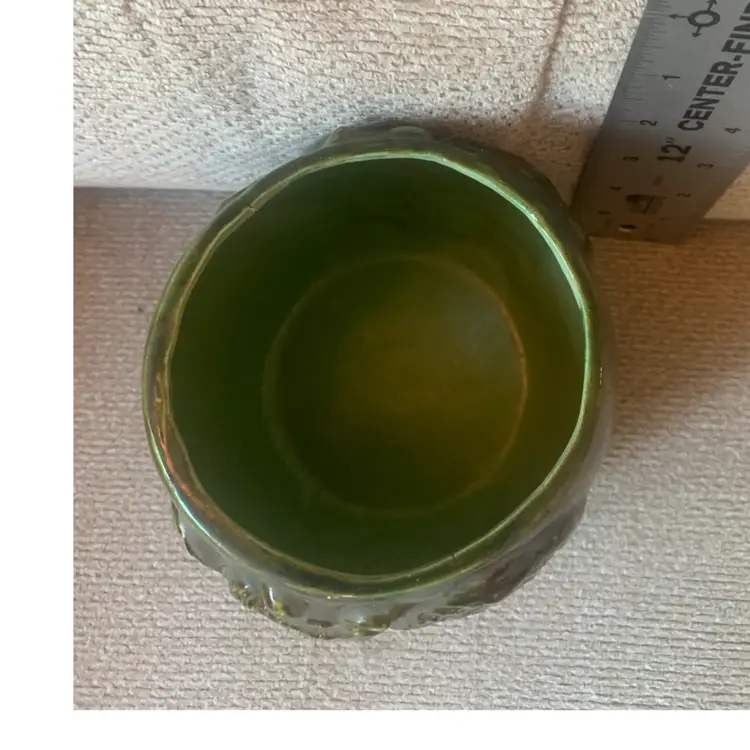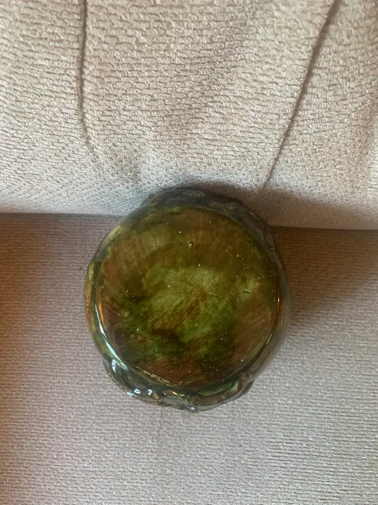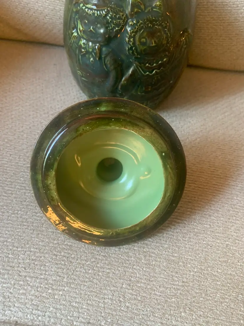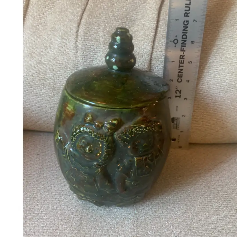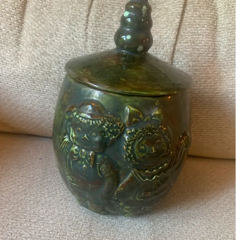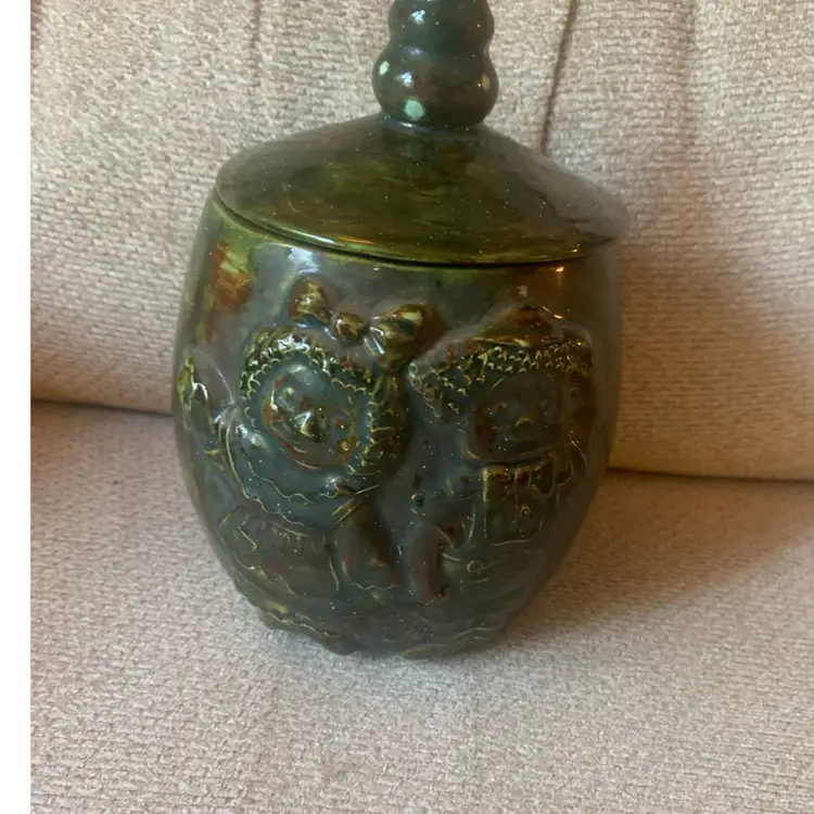 This artisan made ceramic Raggedy Ann and Andy biscuit jar has no chips or cracks. Looking at the figures on both side you can see they are in different poses. The outside green glaze is marbled with different browns and greens. The inside is a lime green. It is about 7 inches tall and 4 inches in diameter. There are a few rough glaze marks on the bottom. It is unsigned.