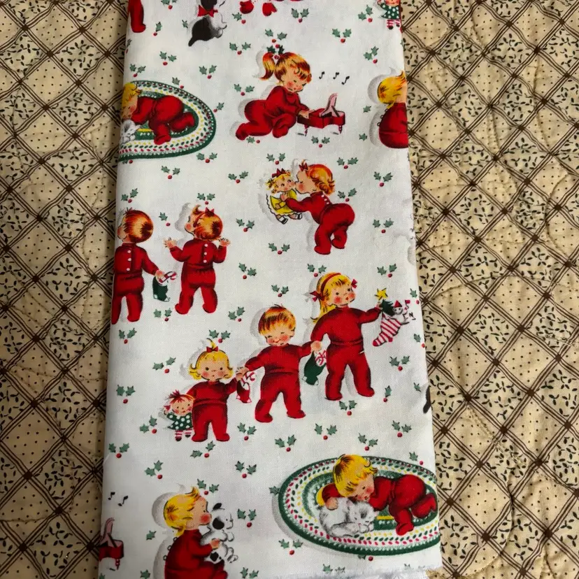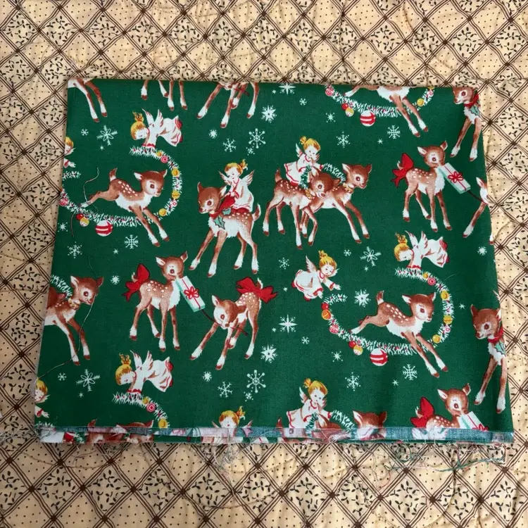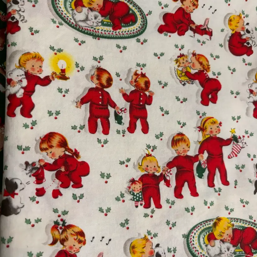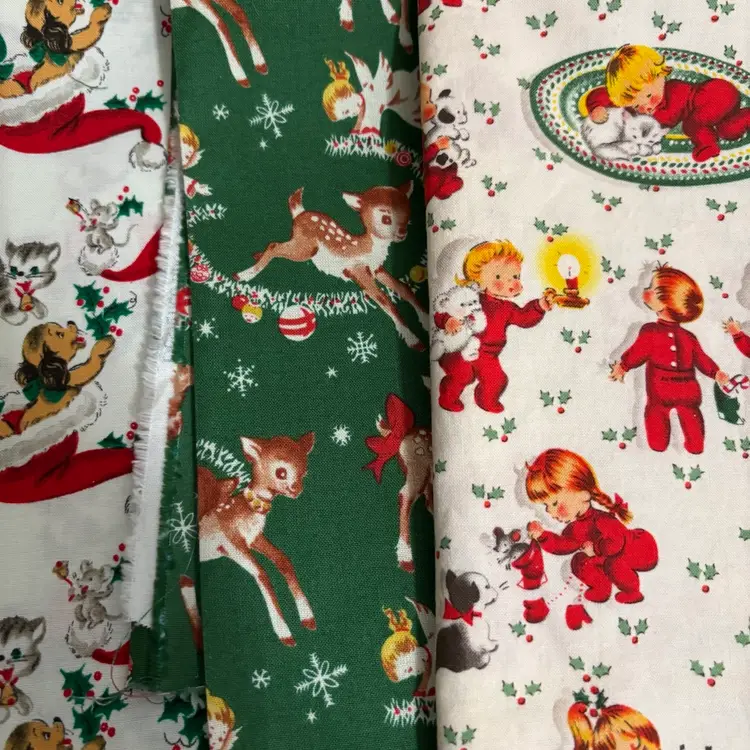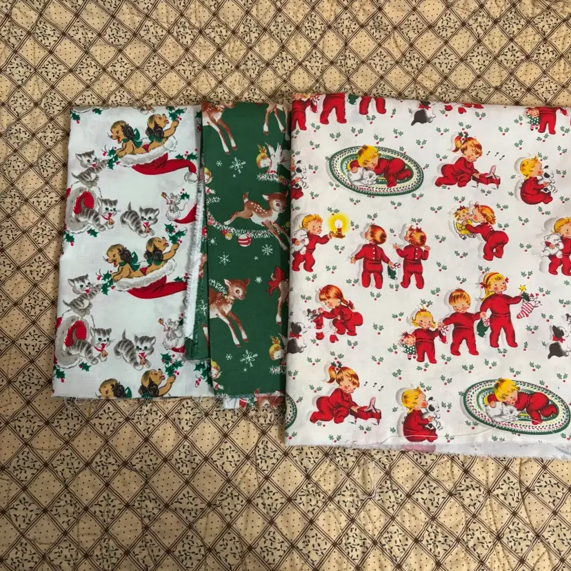 3 pieces of reproduction vintage inspired novelty prints measuring - dogs: 1/2 yd, deer: 1/2 yd and children in red PJ’s: 1/2. Total 1.5 yds. Out of print. Mid 2000’s. Prewashed. Crafts, quilting or sewing.