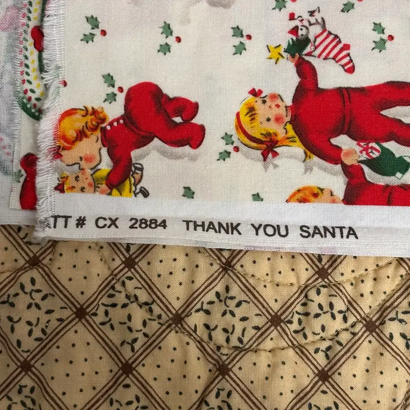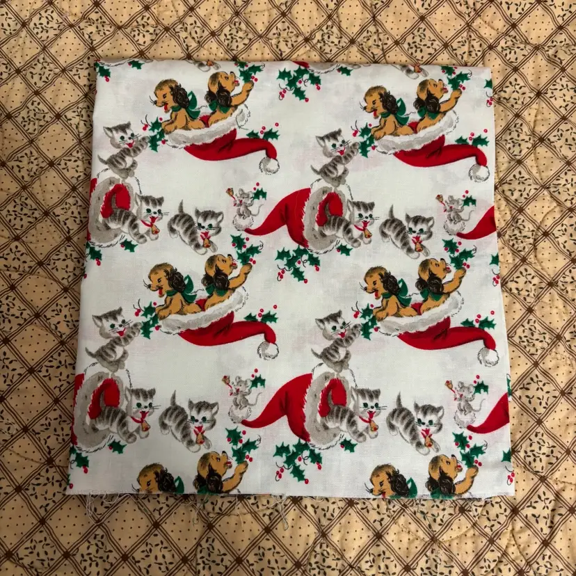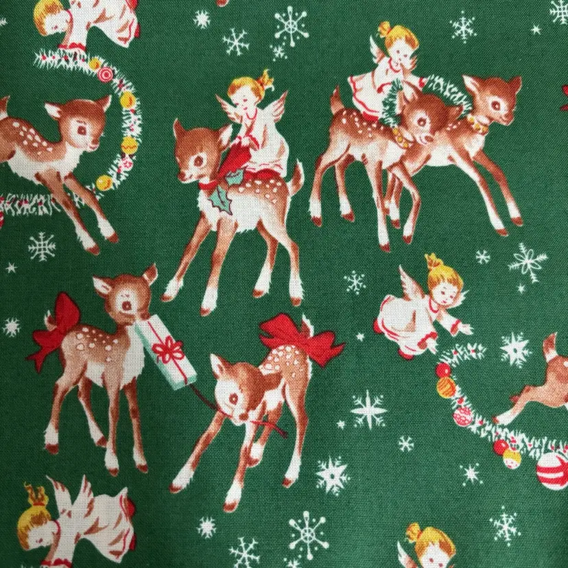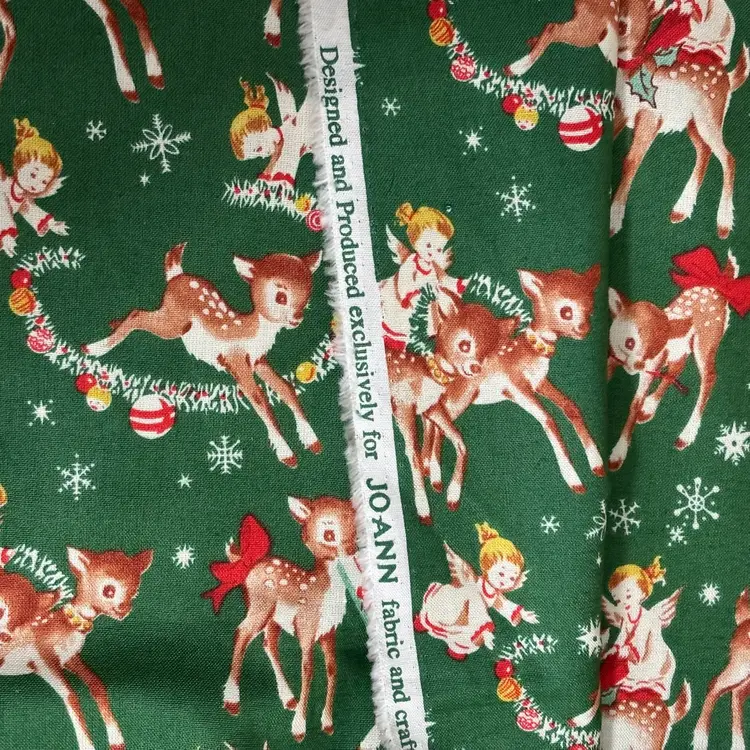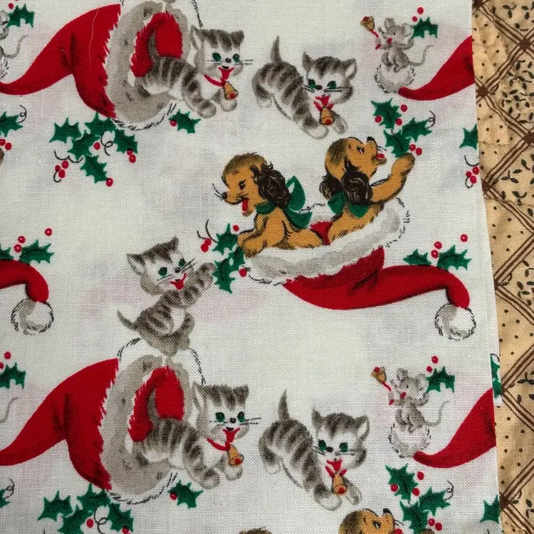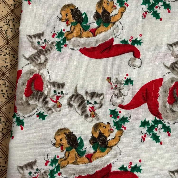 3 pieces of reproduction vintage inspired novelty prints measuring - dogs: 1/2 yd, deer: 1/2 yd and children in red PJ’s: 1/2. Total 1.5 yds. Out of print. Mid 2000’s. Prewashed. Crafts, quilting or sewing.