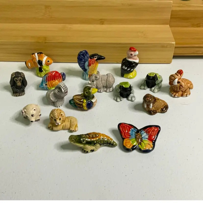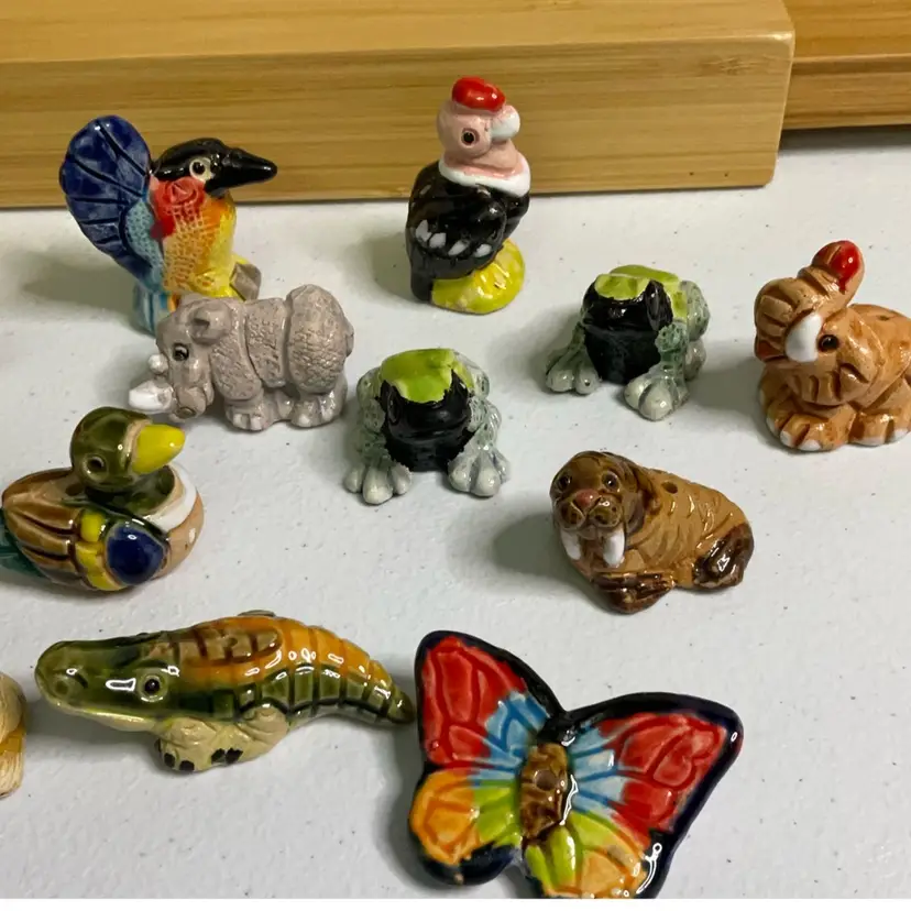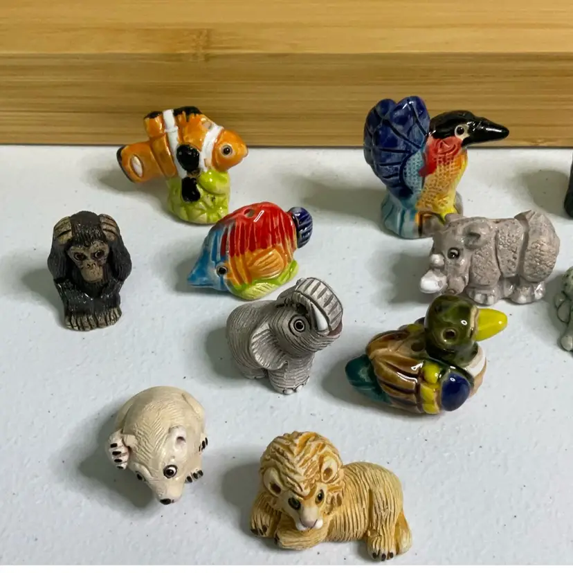 As shown. Approximately 1 inch long heights vary from .50 to 1 inches tall Polar bear, panda bear, monkey, lion, zebra, elephant, rhino, brown elephant, buzzard, humming bird, 2 fish, 2 frogs, walrus, duck, crocodile, butterfly. Rhino, brown elephant, walrus, duck, crocodile, buzzard, fish, butterfly appear to have been made as beads.