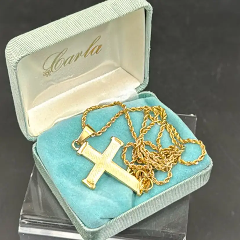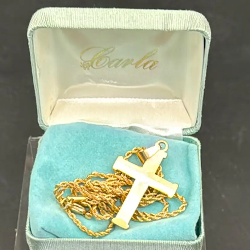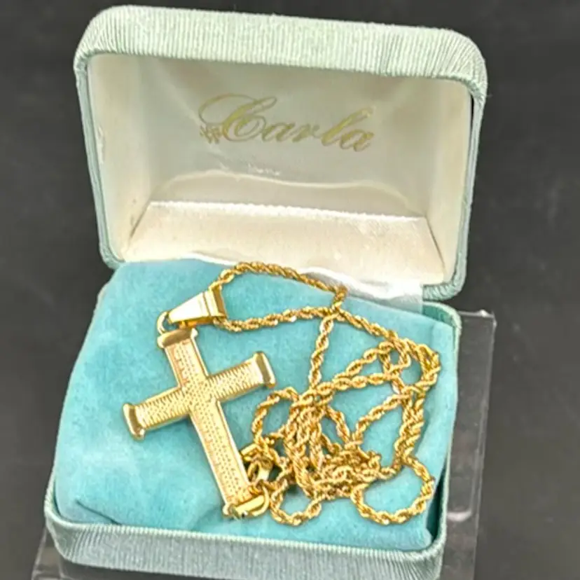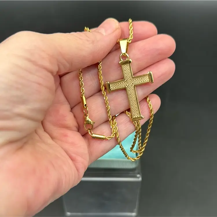 24”long chain made out of stainless steel gold to only in wonderful condition. There are no makers mark except for in the back it says stainless steel nice piece.