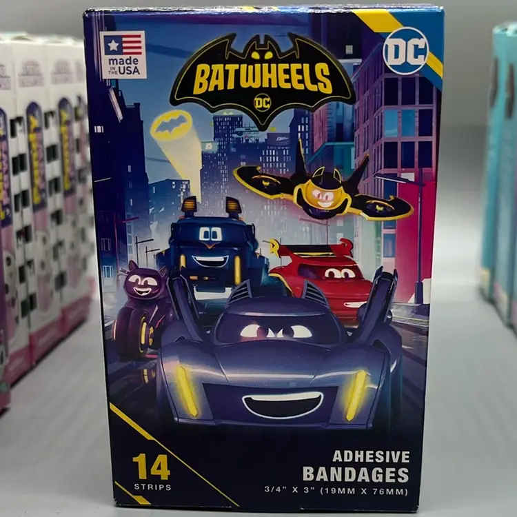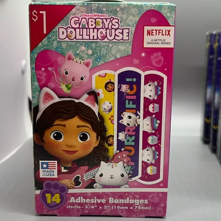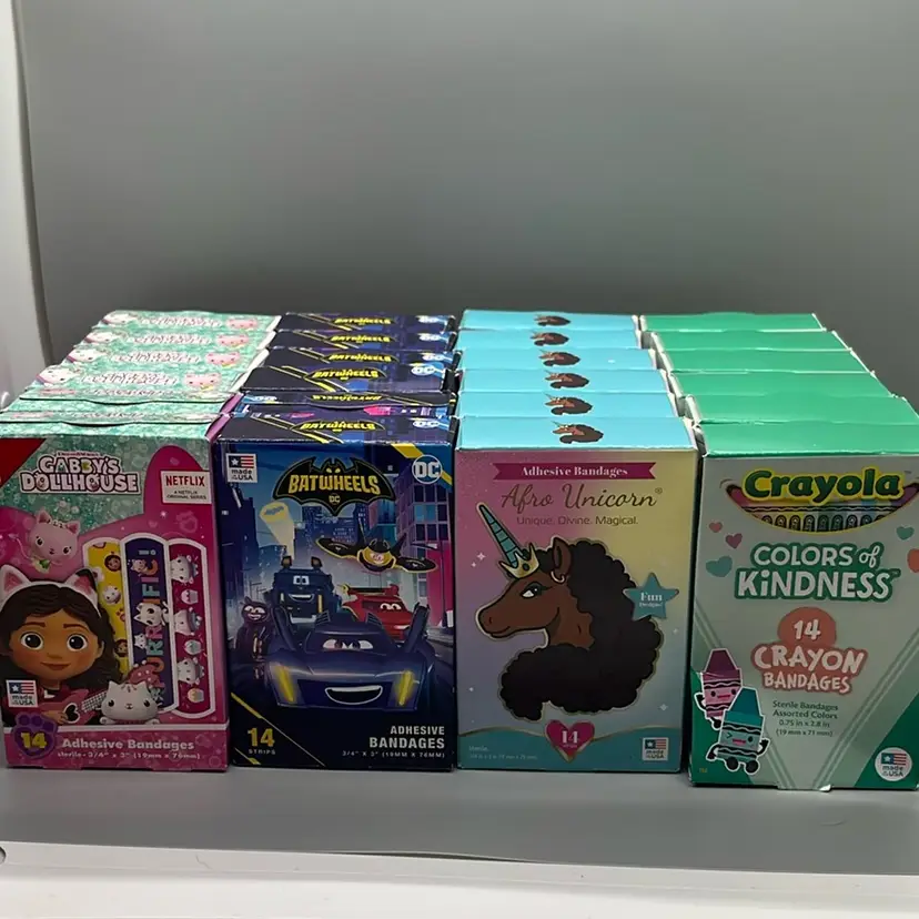 24 boxes total with 14 bandages in each box. -Gabby’s Dollhouse -Batwheels -Afro Unicorn -Crayola
