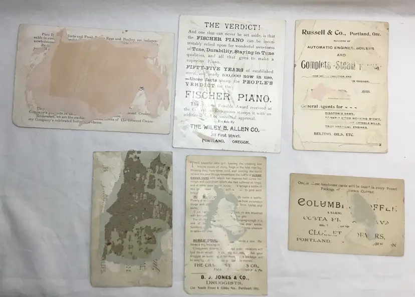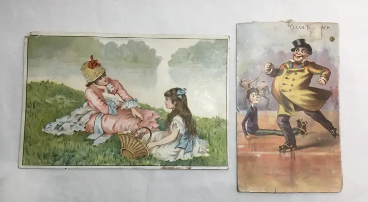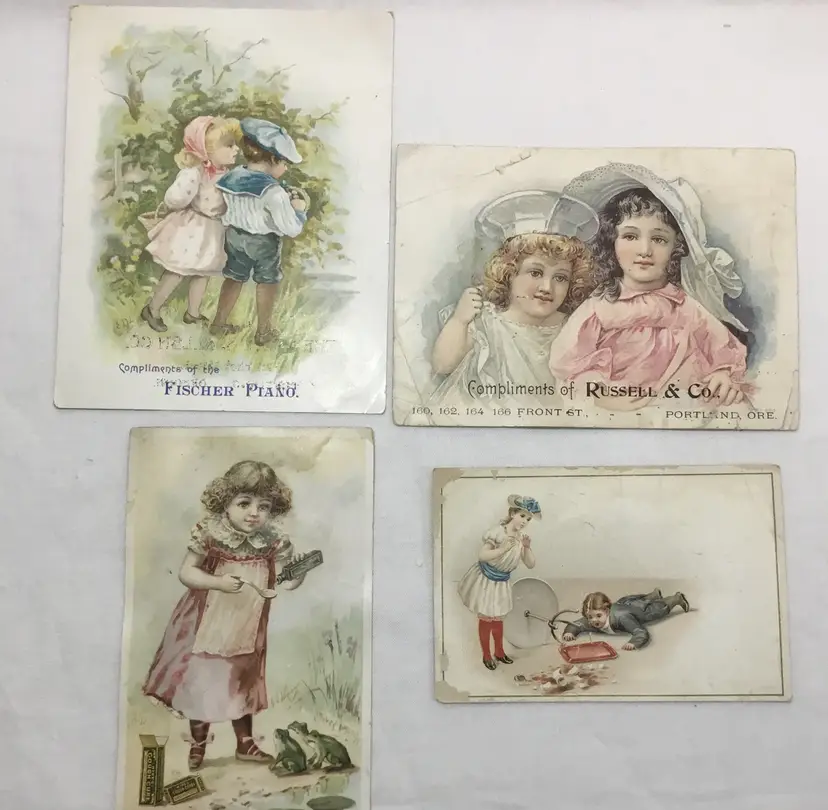 Lot of 6 antique advertising cards. 4 have children on them, 2 have adults or adult and child. Advertisers are, pianos, eggs and poultry, engines and boilers, coffee, druggist. Card with roller skaters on it is unreadable on the back due to glued on paper. Good condition, all have been taken out of an album so have piece of paper glued on the backs or missing print on backs, one has torn edge, one has small tear in center, one missing print on front, three have bent corners. (See all photos)