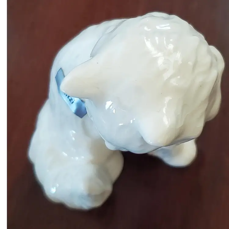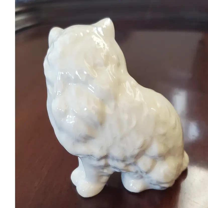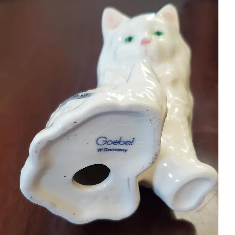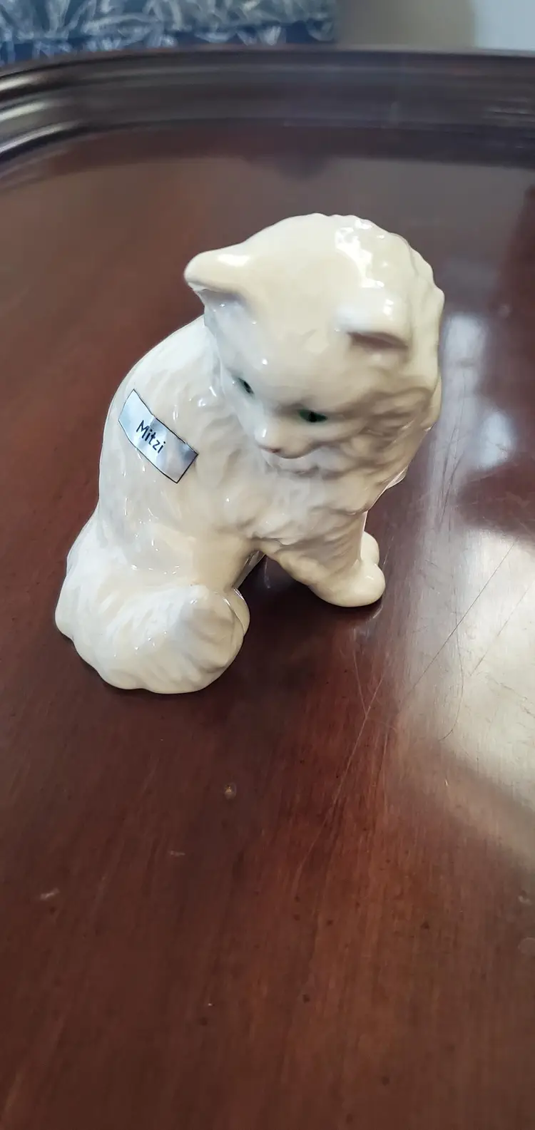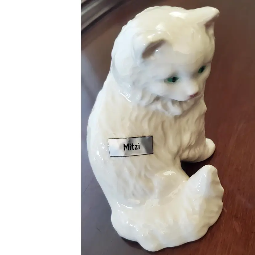 Beautiful white cat with green eyes. She has her original sticker with her name Mitzi. 3 1/4 " tall by 3" wide. Approximately 2 1/2" deep. In perfect condition with some crazing.
