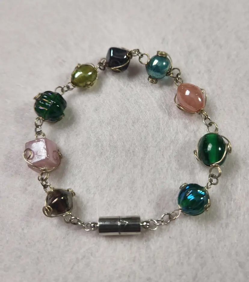 Recycled wire wrapped bracelets made with earrings and pendants. Untested.