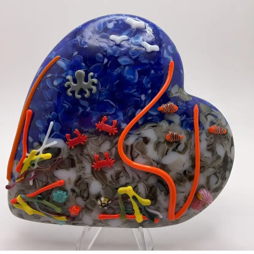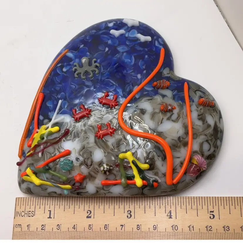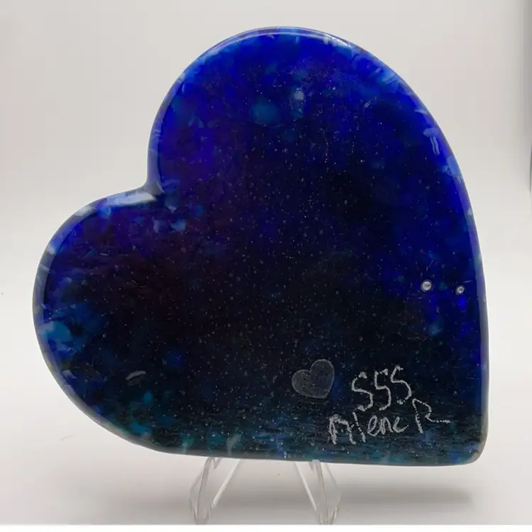 Large, fused glass heart paperweight, kiln made with love by me! Each heart is unique and varies in color placement, bubbles and depth of field. Shiny on the front, textured on the back, approximately 5 x 4 1/4-inches; weighs approximately 510 grams. Made with Bullseye glass and elements from other glass artists. Plastic easel included for display. SIGNED BY ME: SSS AleneR