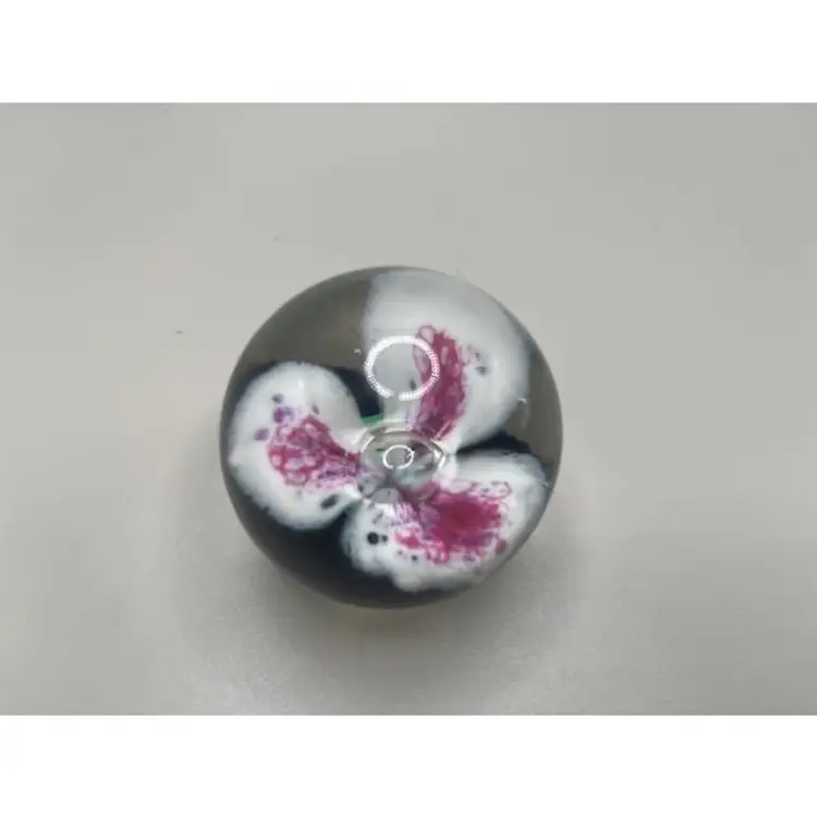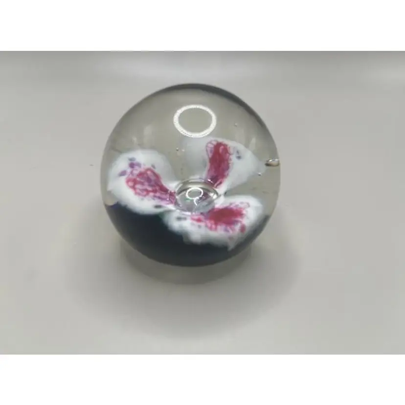 Add a touch of elegance to your desk or shelf with this vintage art glass paperweight, featuring a beautiful floral design in pink and white. A perfect collectible piece for art glass enthusiasts.