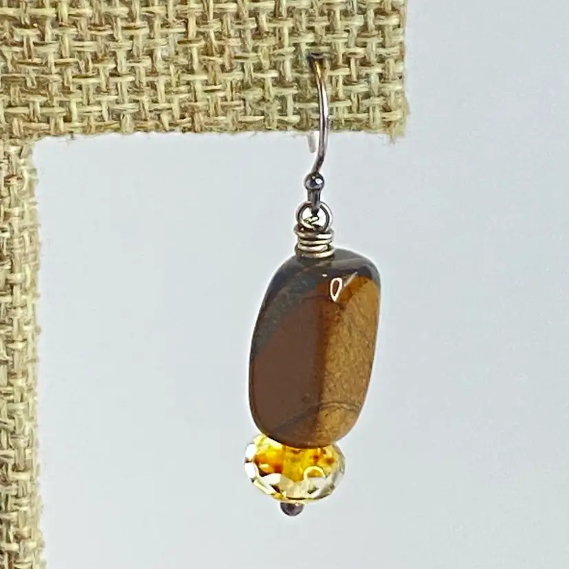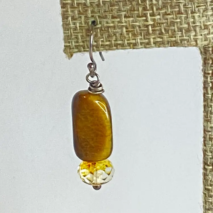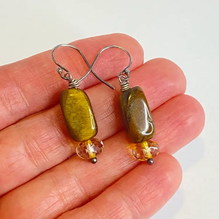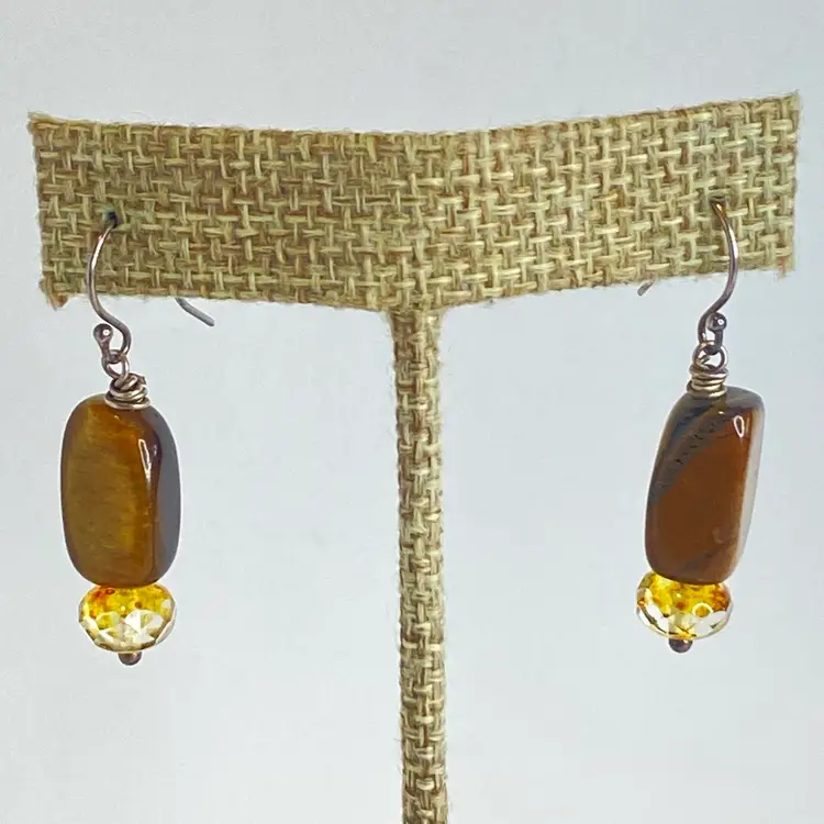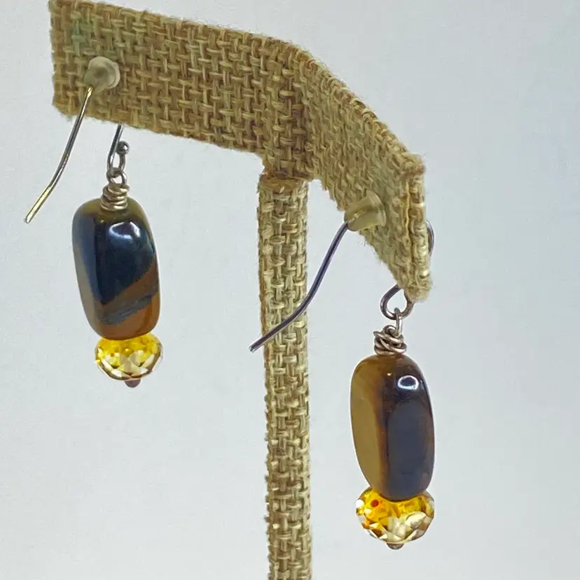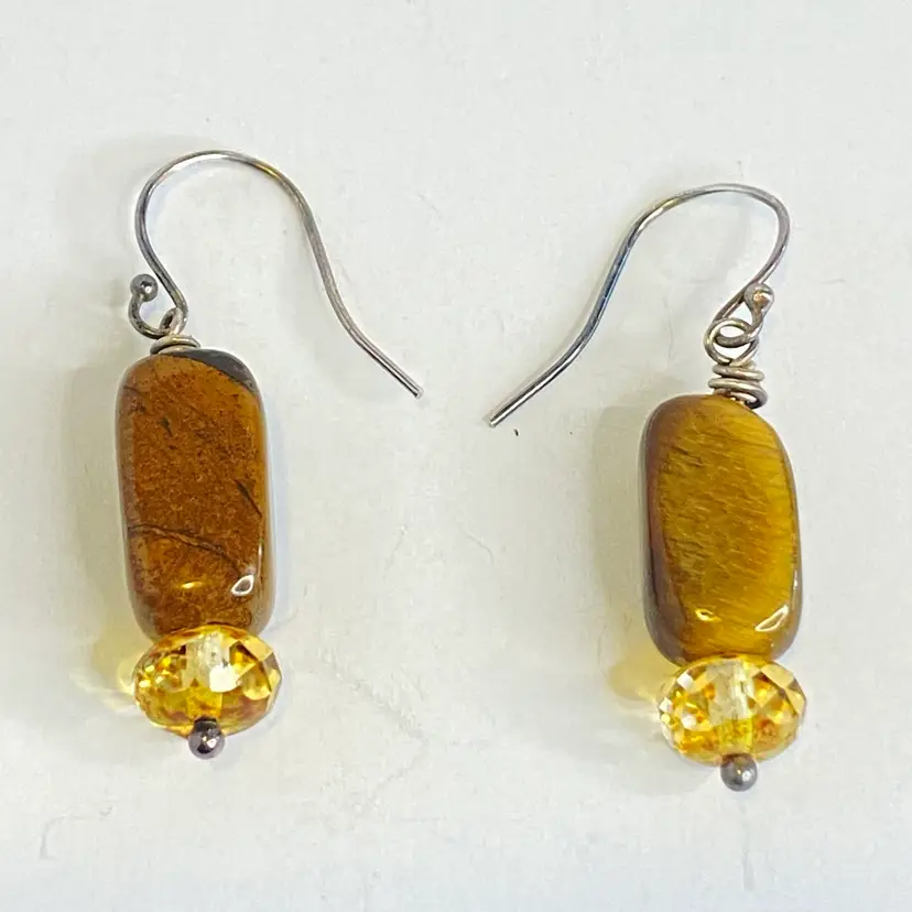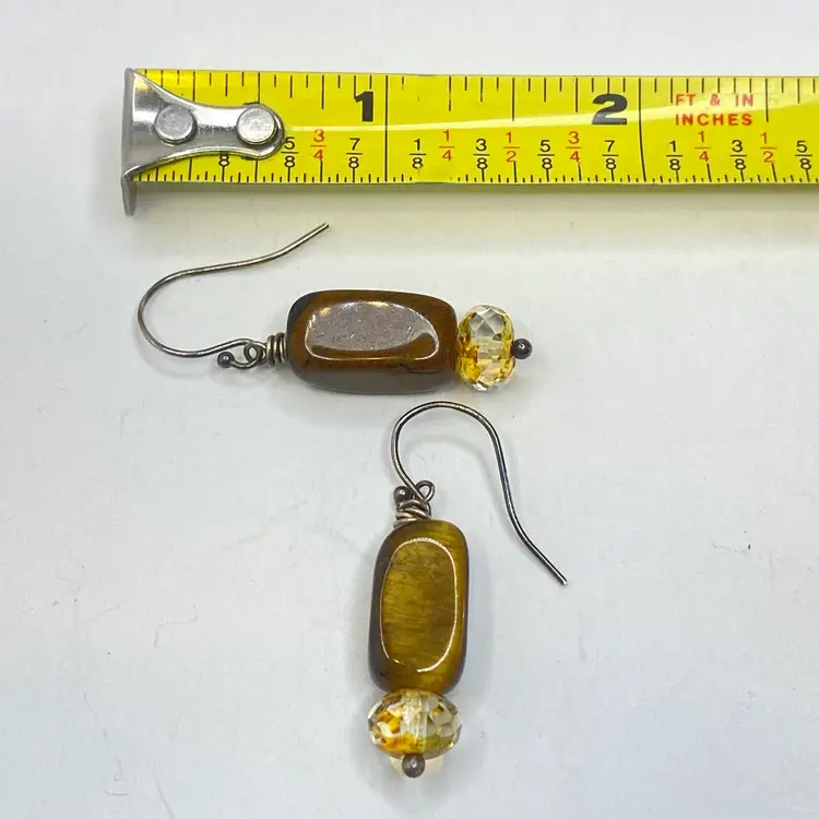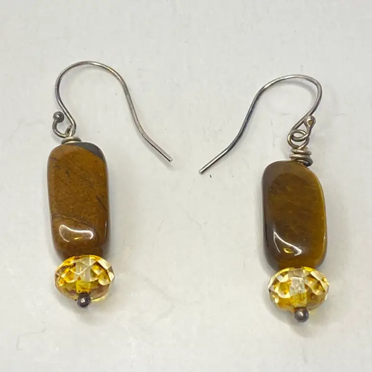 Sterling Silver Tiger's Eye Earrings S925 Dangle Faceted Amber Bead Artisan. These artisan dangle earrings feature rectangular tiger's eye gemstone beads with rich golden brown chatoyancy, paired with faceted amber/citrine colored glass rondelles that catch the light beautifully. Each earring is wire-wrapped by hand and suspended from sterling silver (marked S925) ear hooks. The natural shimmer of the tiger's eye paired with the sparkle of the faceted beads creates a warm, earthy elegance perfect for everyday wear or gifting. Good condition. Please see pictures for details.