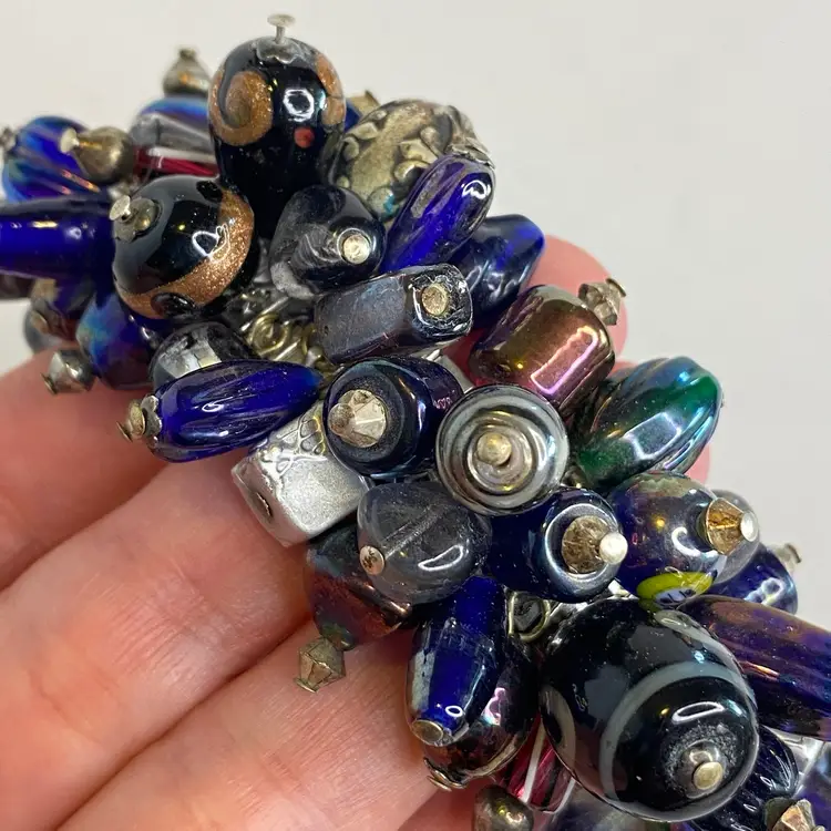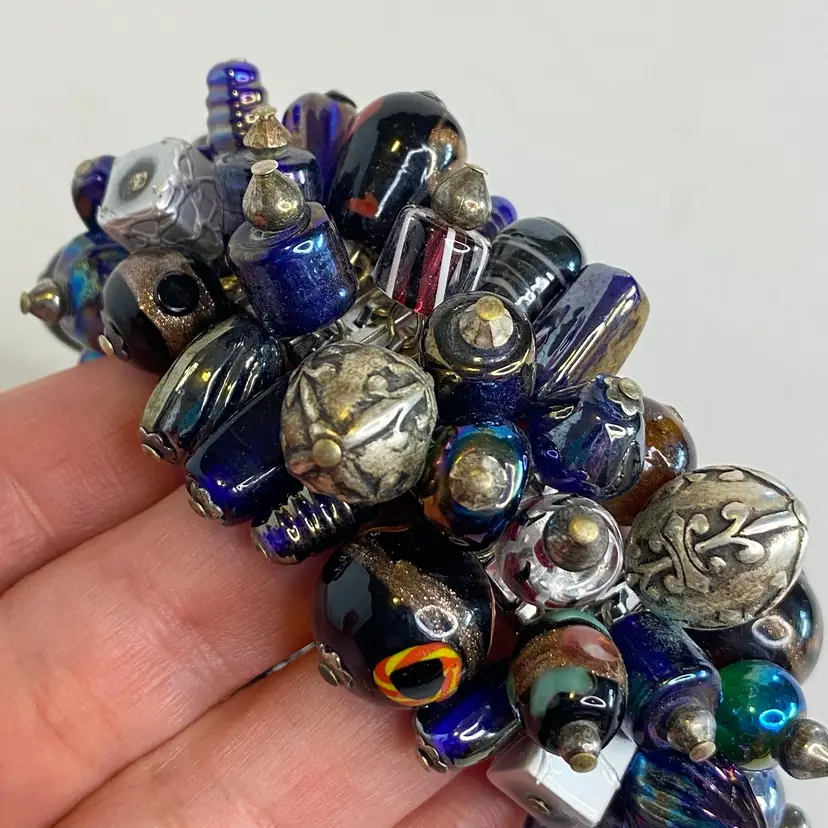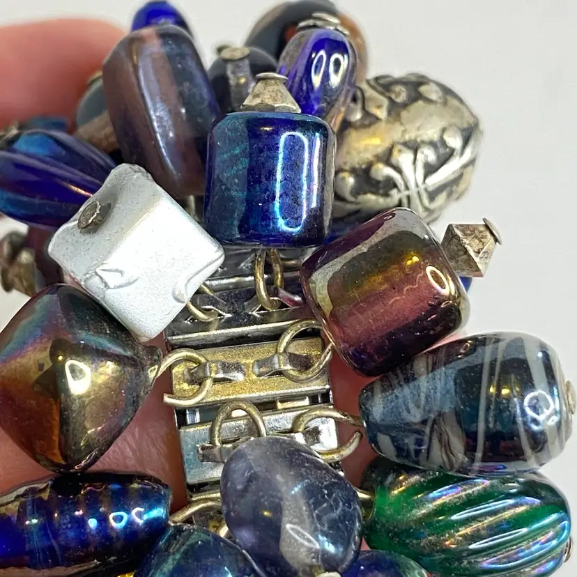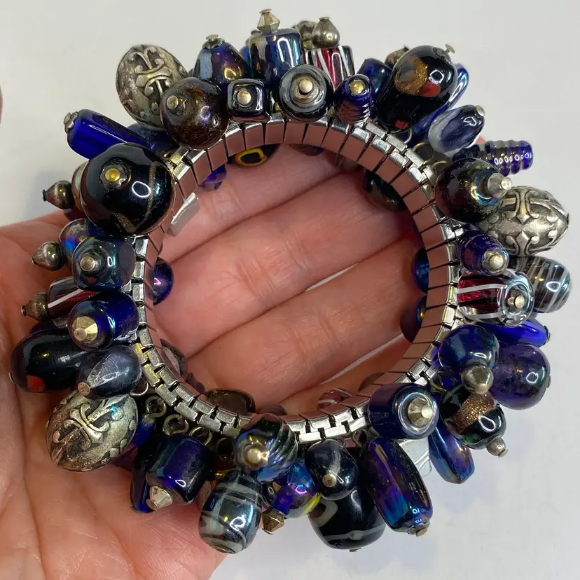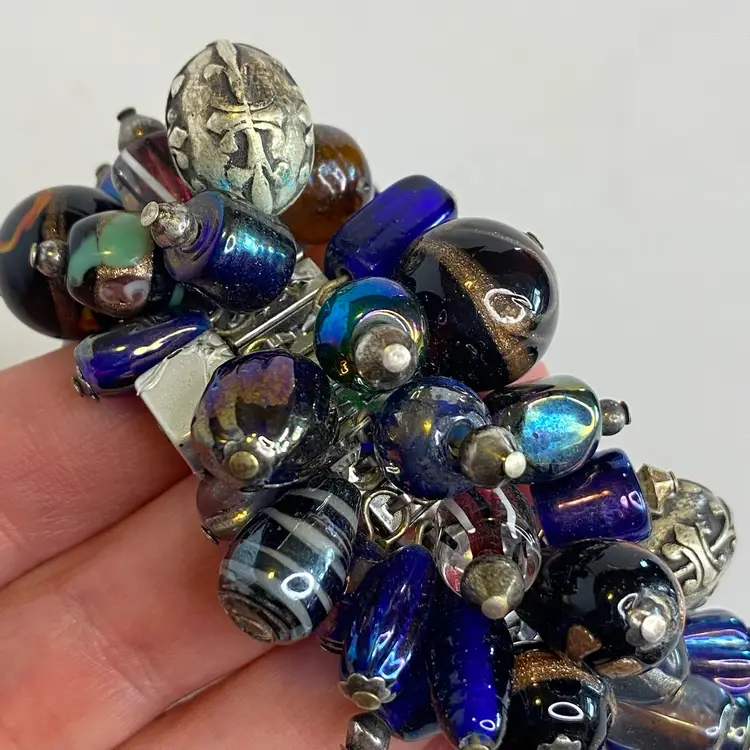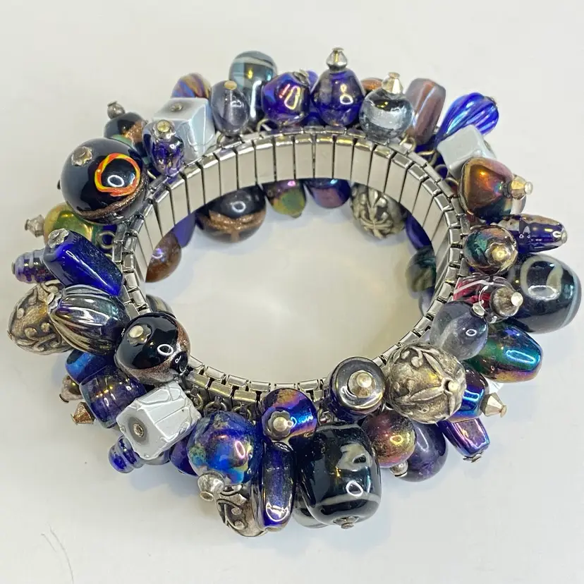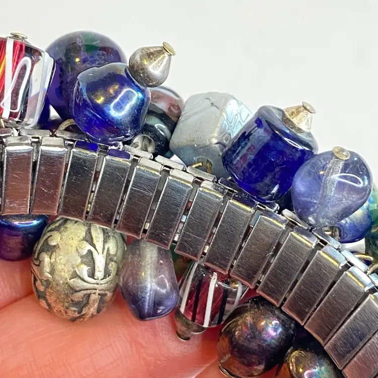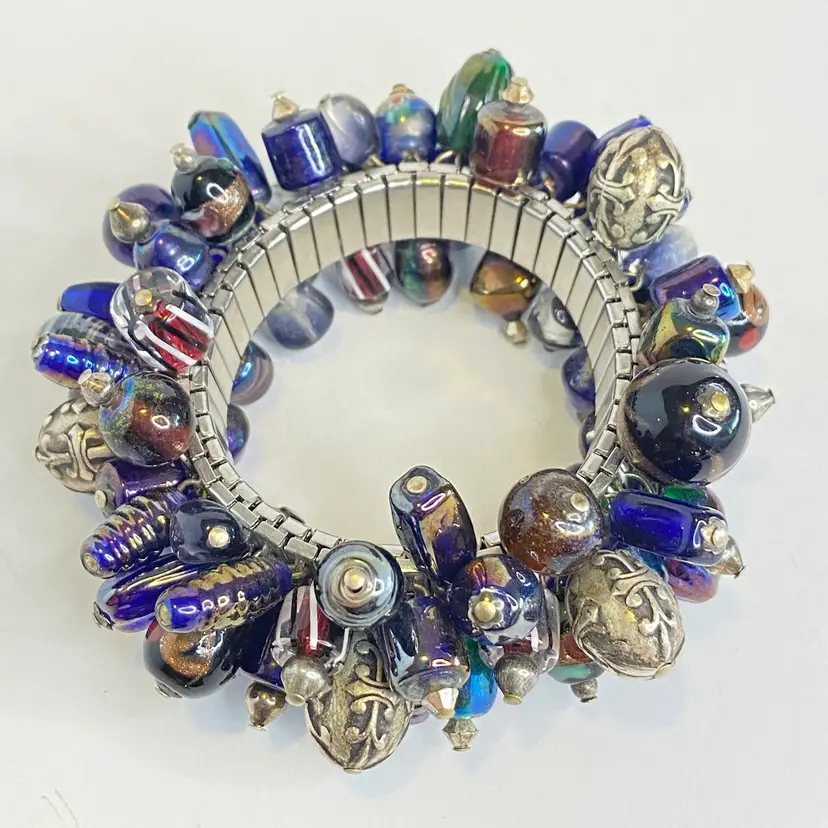 Vintage Artisan Cha-Cha Bracelet Glass Beads Silver Tone Stretch Handmade OOAK. This eye-catching bracelet features dozens of artisan-crafted lampwork, foil glass, and metal accent beads in shades of cobalt, amethyst, and iridescent hues. The beads are securely attached to a high-quality silver-tone expansion band that adjusts to fit most wrists (approx. 6" to 7"). The design includes Murano-style striped cane beads, translucent glass nuggets, and engraved antiqued metal elements, creating a maximalist, jangly statement piece. Ideal for lovers of bohemian, eclectic, or artsy jewelry styles. Unsigned, but clearly handcrafted and likely one-of-a-kind. Excellent condition with secure stretch band and no missing components.