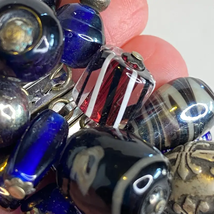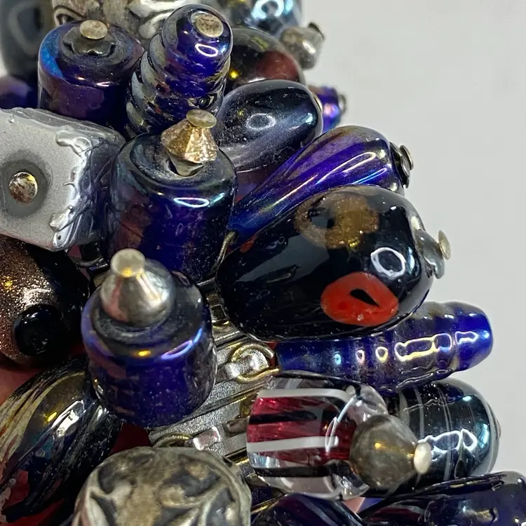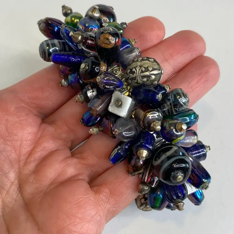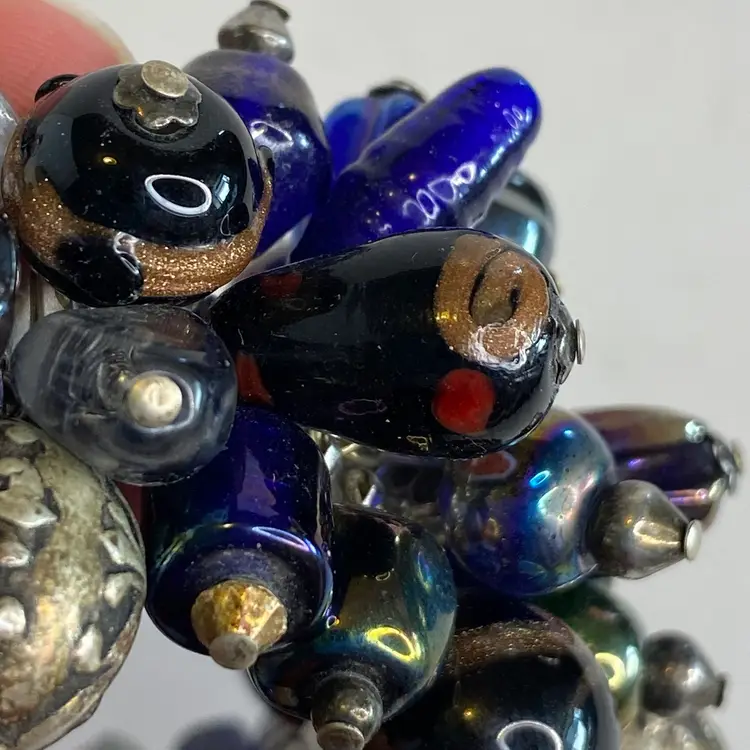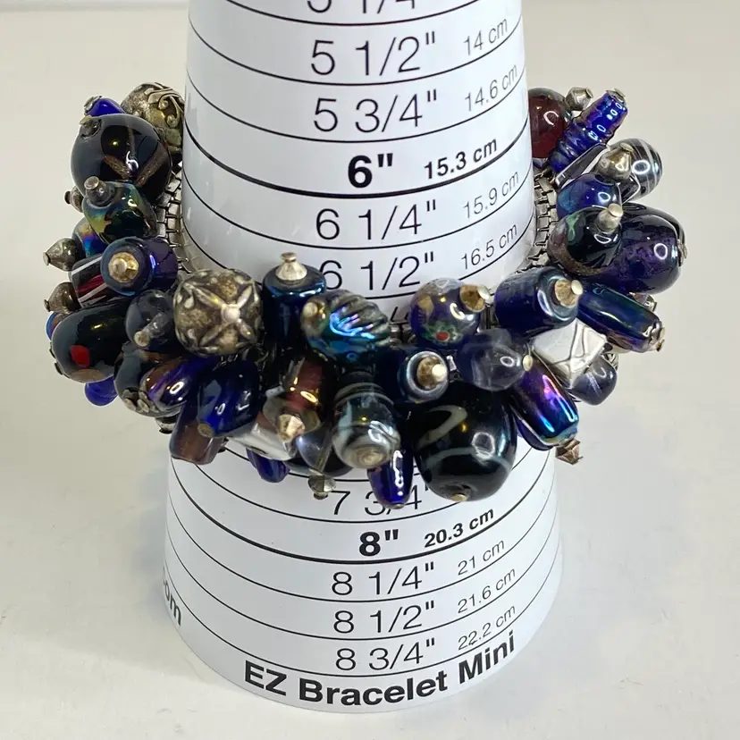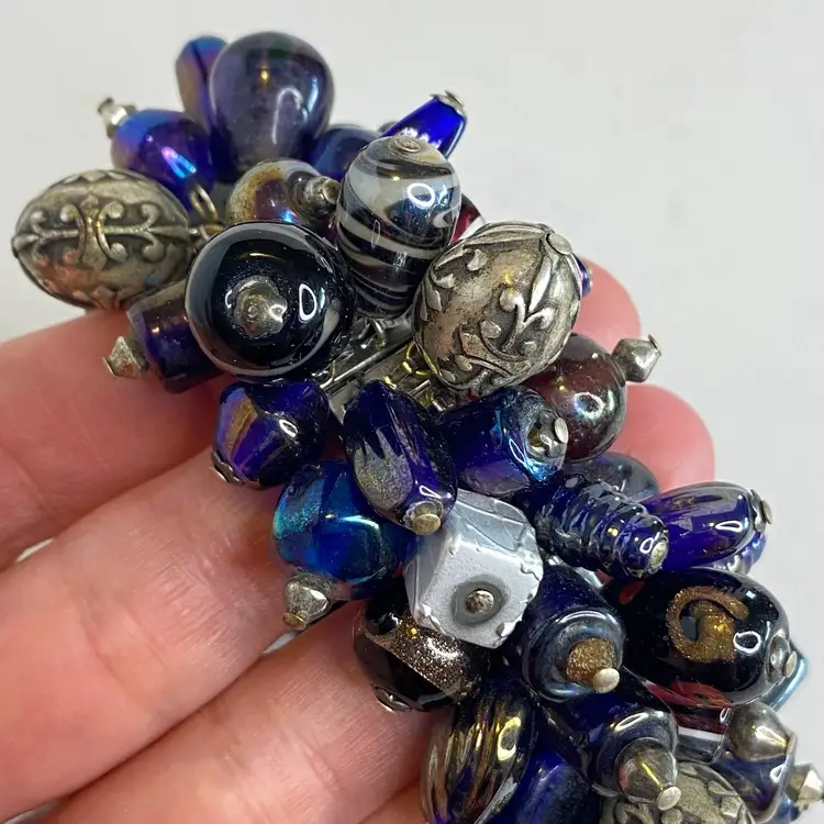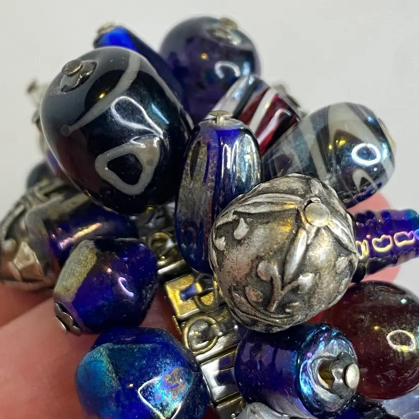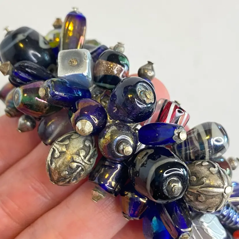 Vintage Artisan Cha-Cha Bracelet Glass Beads Silver Tone Stretch Handmade OOAK. This eye-catching bracelet features dozens of artisan-crafted lampwork, foil glass, and metal accent beads in shades of cobalt, amethyst, and iridescent hues. The beads are securely attached to a high-quality silver-tone expansion band that adjusts to fit most wrists (approx. 6" to 7"). The design includes Murano-style striped cane beads, translucent glass nuggets, and engraved antiqued metal elements, creating a maximalist, jangly statement piece. Ideal for lovers of bohemian, eclectic, or artsy jewelry styles. Unsigned, but clearly handcrafted and likely one-of-a-kind. Excellent condition with secure stretch band and no missing components.
