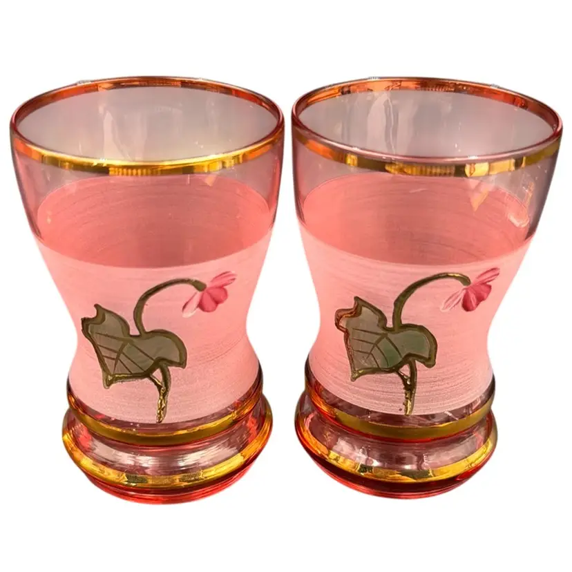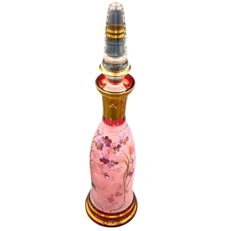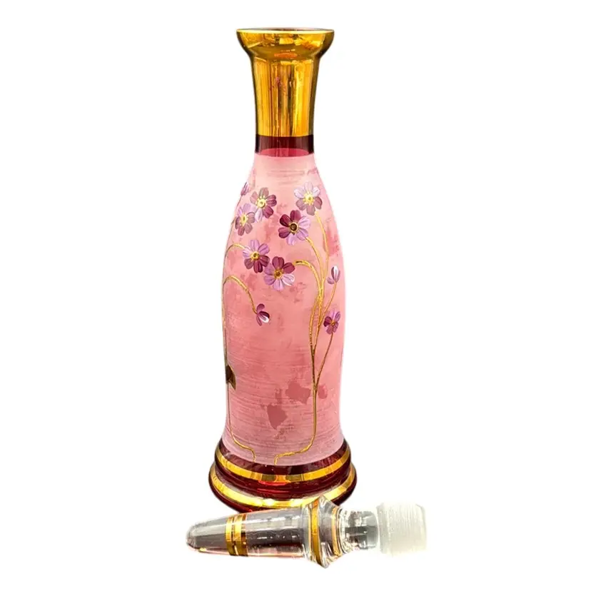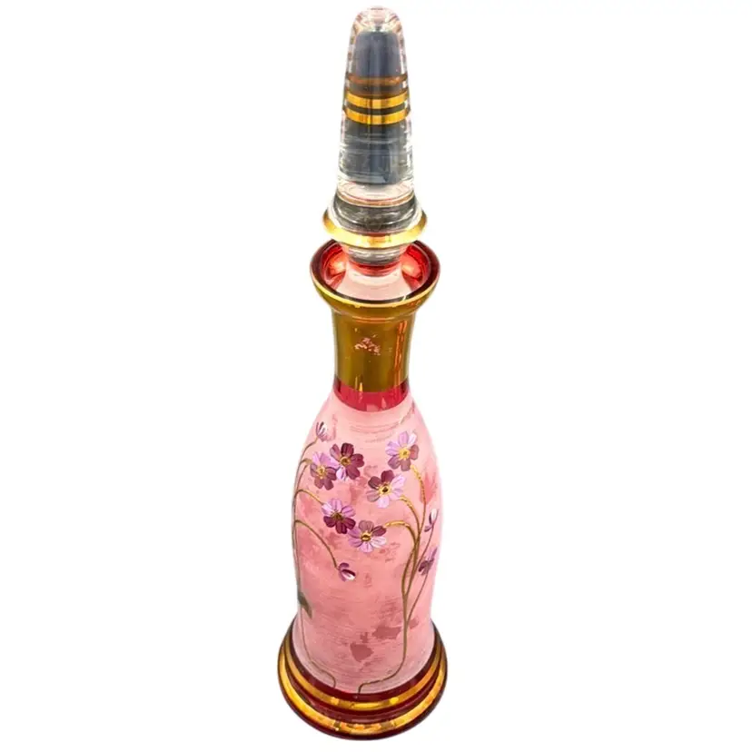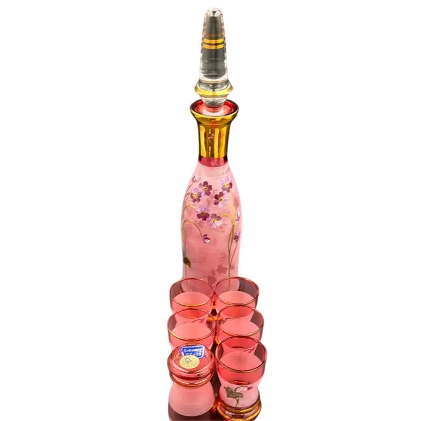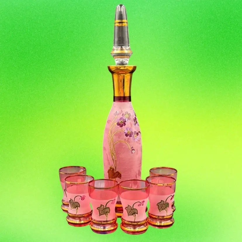 13”T with the stopper 31/3”W stopper is 5”T glasses 23/4”T 23/4”D no chips, cracks or brakes has some ware on the frosted glass, but it doesn’t take away from the beauty of the set has a little wear on the gold leaf below the stopper.