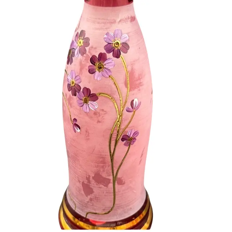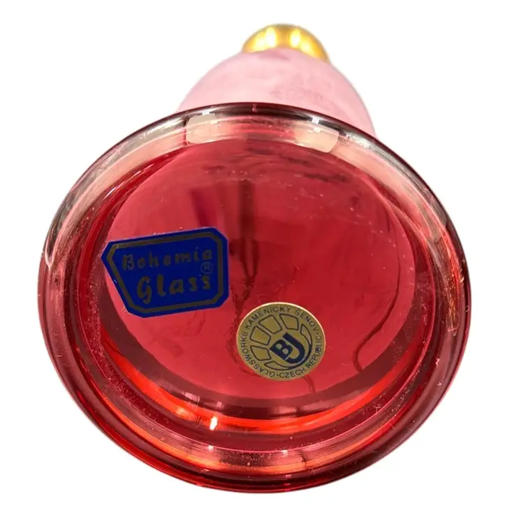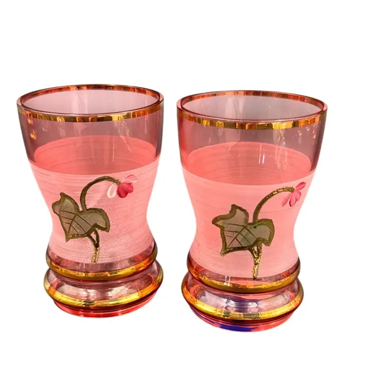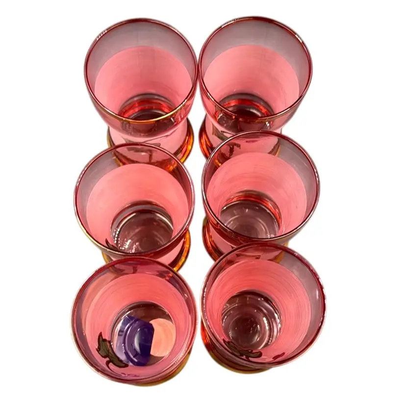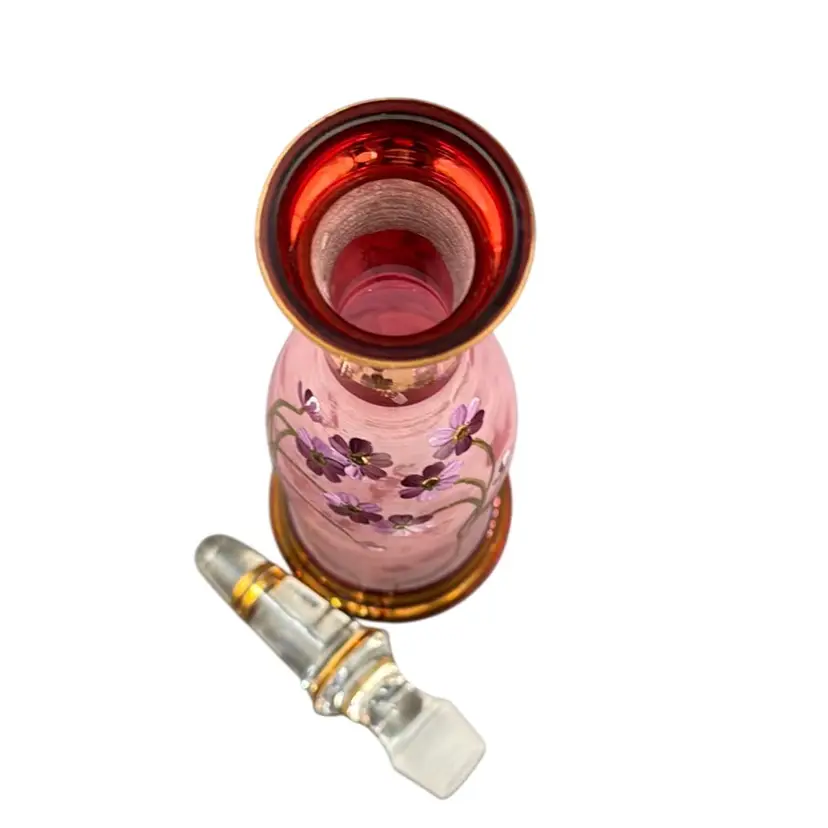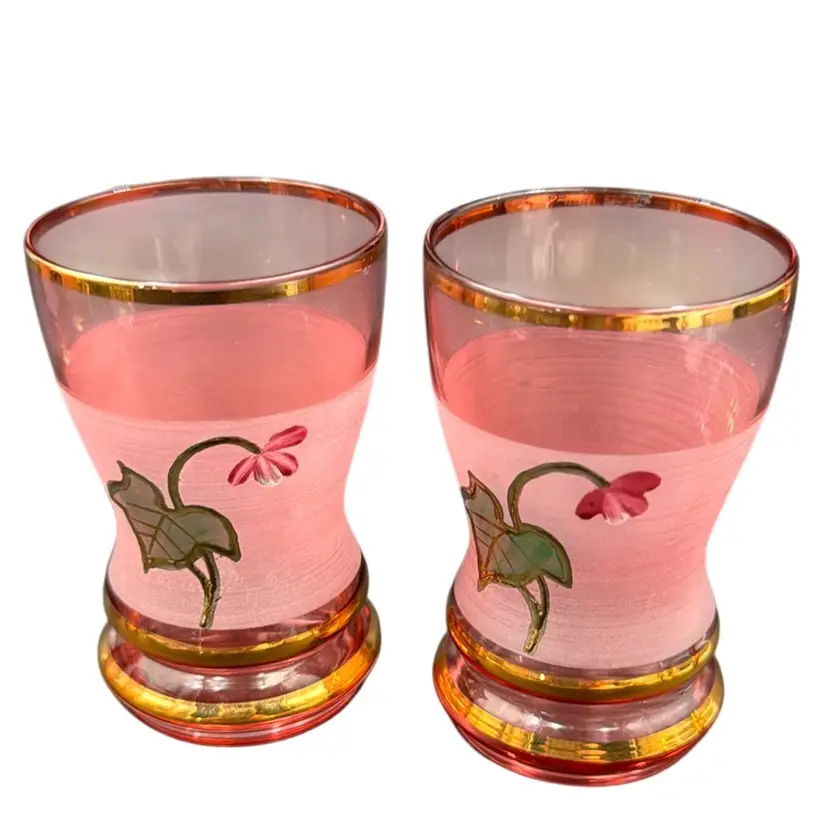 13”T with the stopper 31/3”W stopper is 5”T glasses 23/4”T 23/4”D no chips, cracks or brakes has some ware on the frosted glass, but it doesn’t take away from the beauty of the set has a little wear on the gold leaf below the stopper.