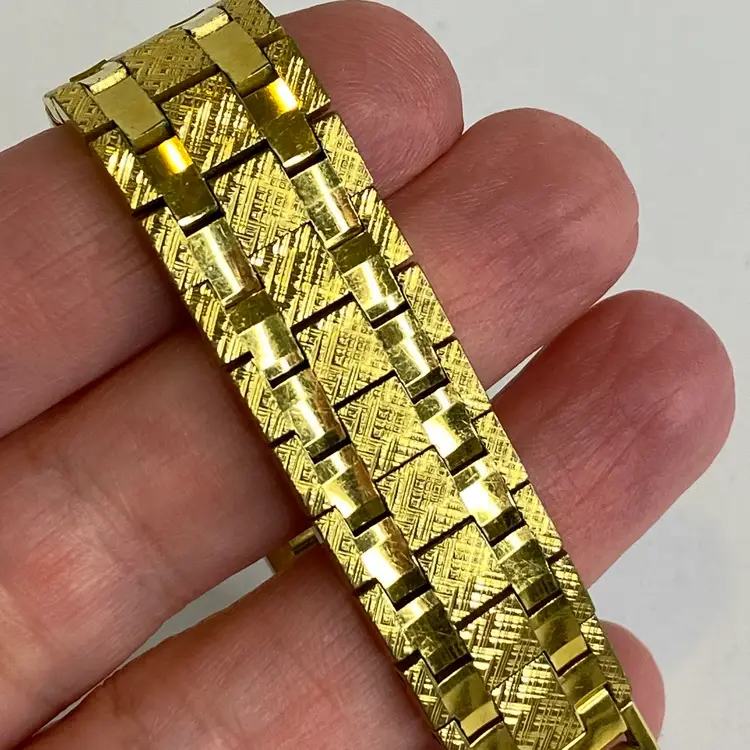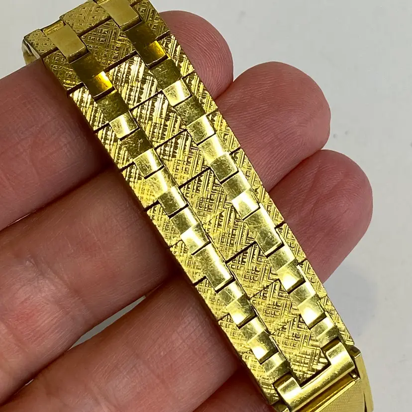 Vintage Bucherer Ladies Swiss Watch Gold Tone Rectangle Face Textured Bracelet. This elegant vintage timepiece by Bucherer features a rectangular dial with gold-tone indices, a signed "B" crown, and an integrated bracelet with a unique textured and polished checkerboard pattern. The dial is marked "Bucherer" with the brand’s logo and "Swiss Made" at the bottom. The caseback reads "Fond Acier Inoxydable" with serial number 52307.