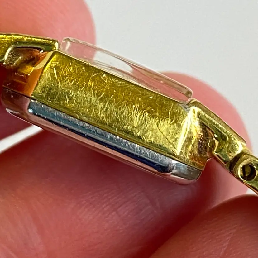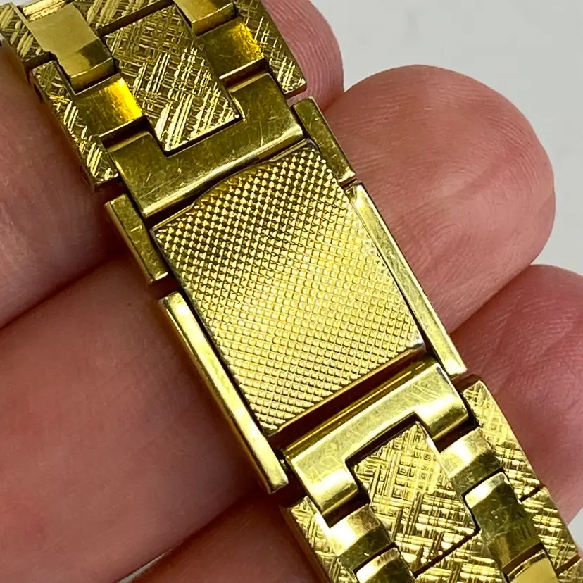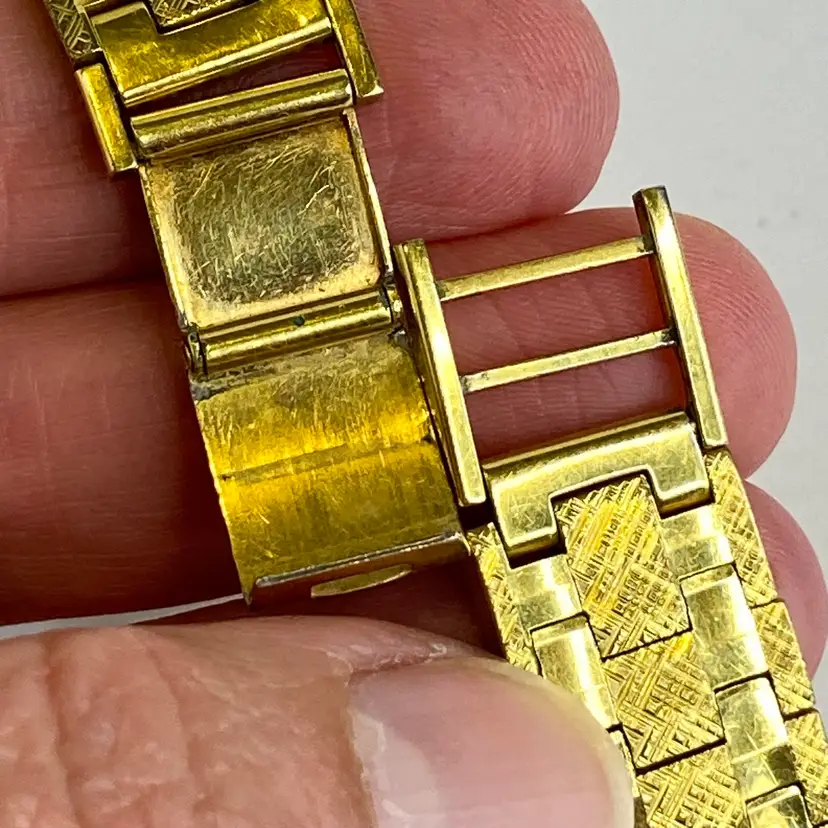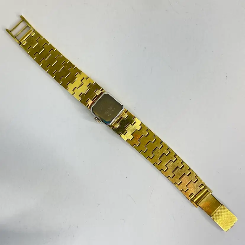 Manual wind movement (untested for accuracy), stainless steel back, gold-tone case and bracelet. The watch measures approximately 7 inches in length and is best suited for a small wrist. In vintage condition with some surface wear consistent with age. SMOKE FREE/PET FREE HOME. Please see pictures for details.