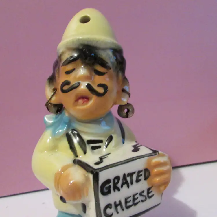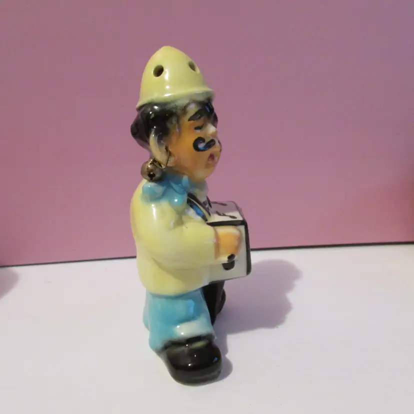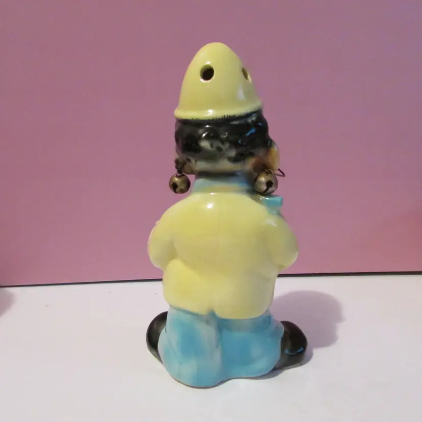 This fun shaker has some wear, his one earring is tied on. Still a nice piece to display, he is about 6 1/2" x 3 1/2" x 3".