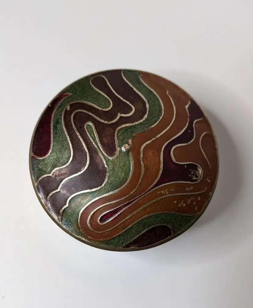 This vintage brass trinket box from Interpur Taiwan is a unique addition to any collection. With intricate details and a beautiful red, green, and gold color scheme, it is sure to catch the eye. The box is perfect for storing small items, such as jewelry or paper clips, and has a deer design on the lid.