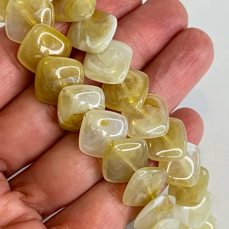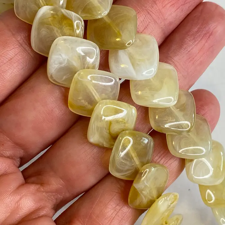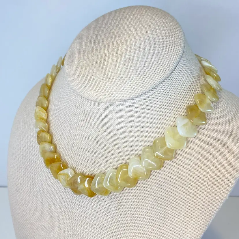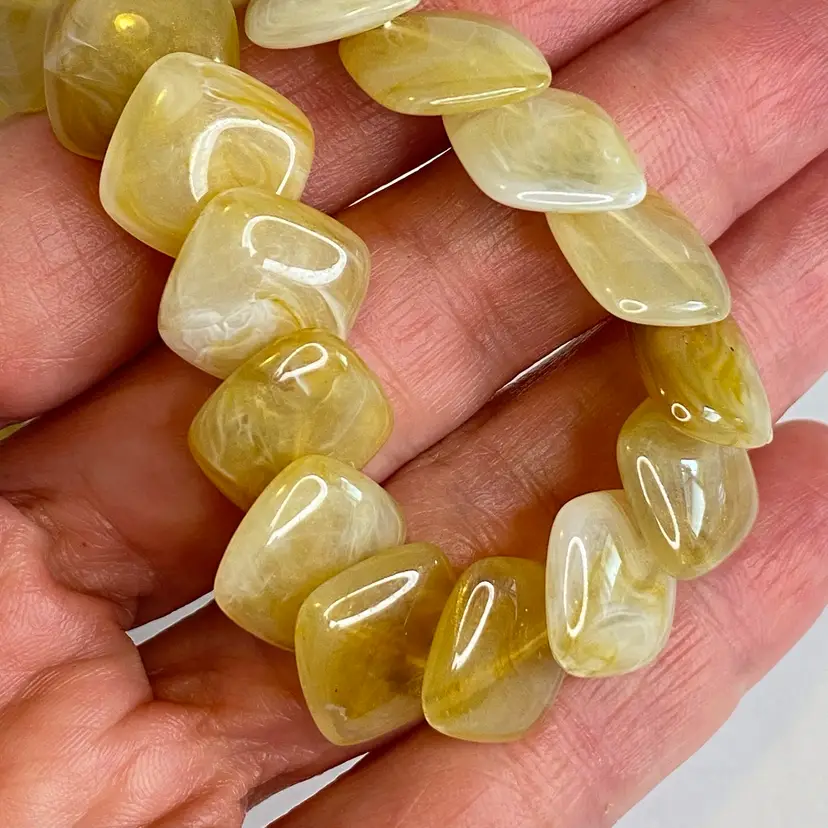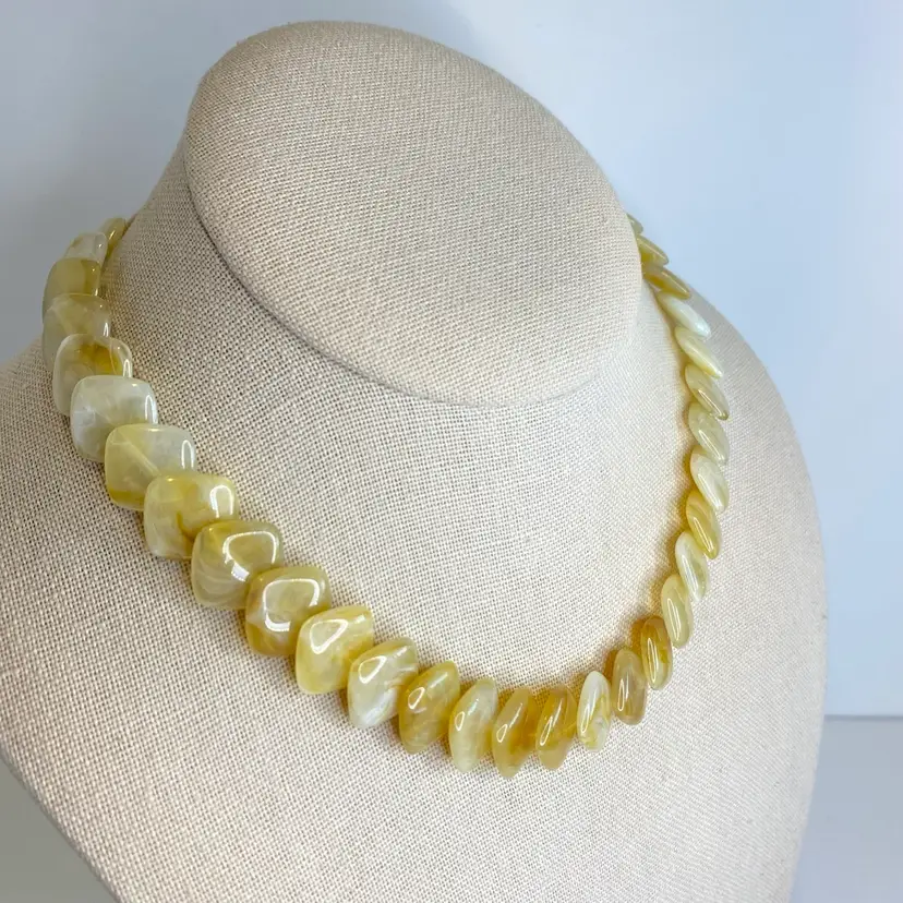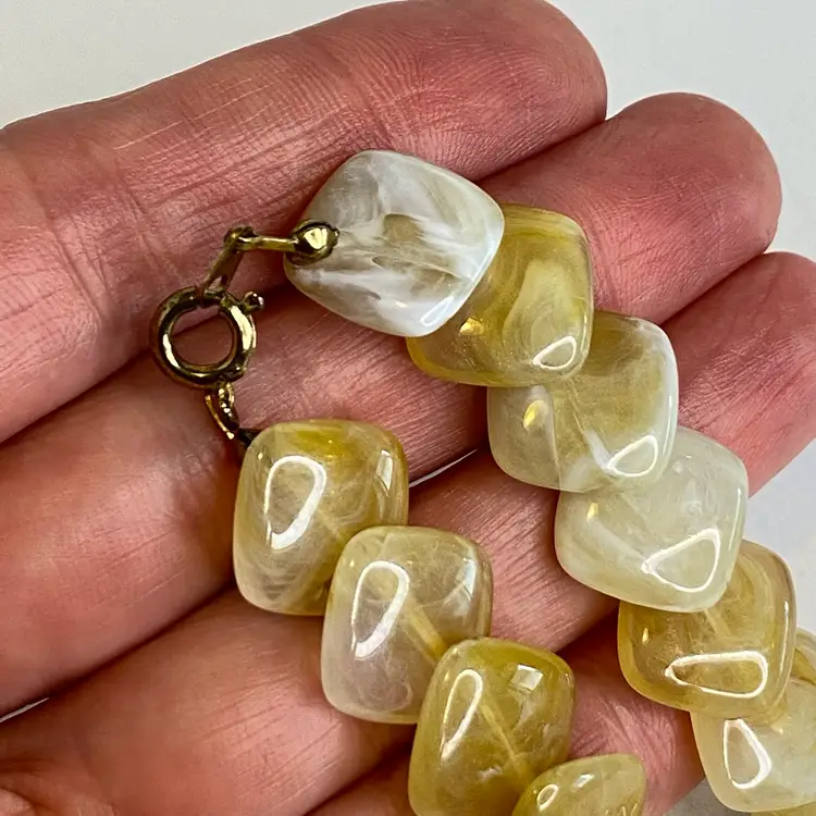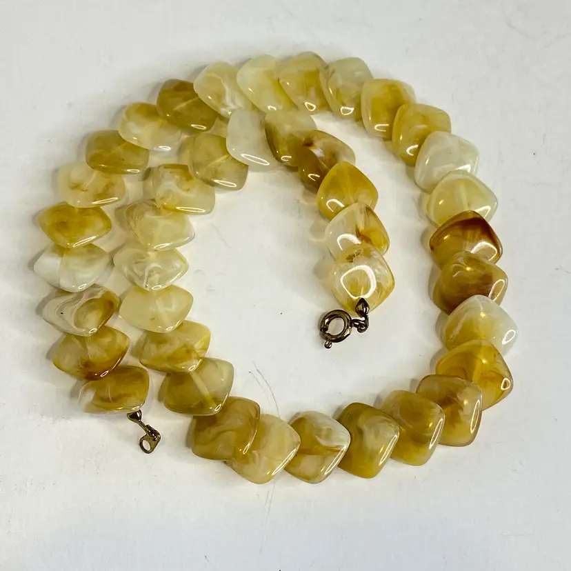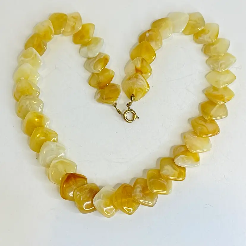 Vintage Lucite Thermoset Bead Necklace Yellow White Tan Swirl Mid Century Plastic. This striking mid-century necklace features glossy, diamond-shaped beads in a marbled yellow and white swirl pattern, made from molded Lucite or thermoset plastic. Each bead is uniquely patterned, giving the necklace a luminous, opalescent look. The necklace is finished with a spring ring clasp and is unmarked. A beautiful statement piece with a classic retro vibe, perfect for collectors or lovers of bold vintage fashion. Measures approximately 16 inches long. Excellent vintage condition with minimal signs of wear. SMOKE FREE/PET FREE HOME.
