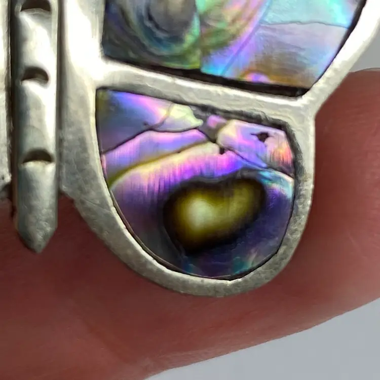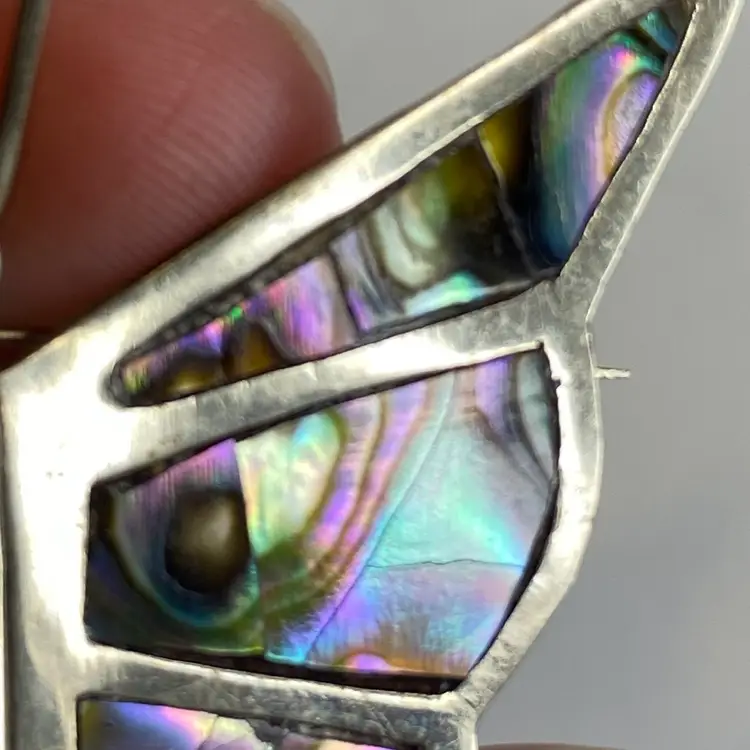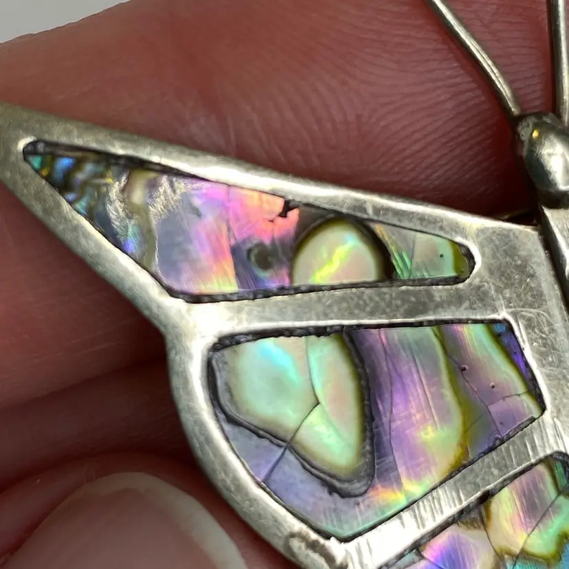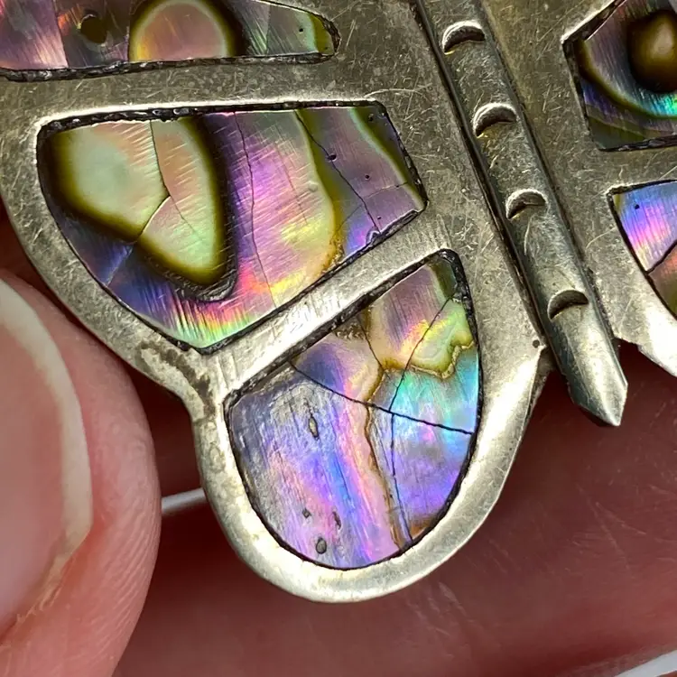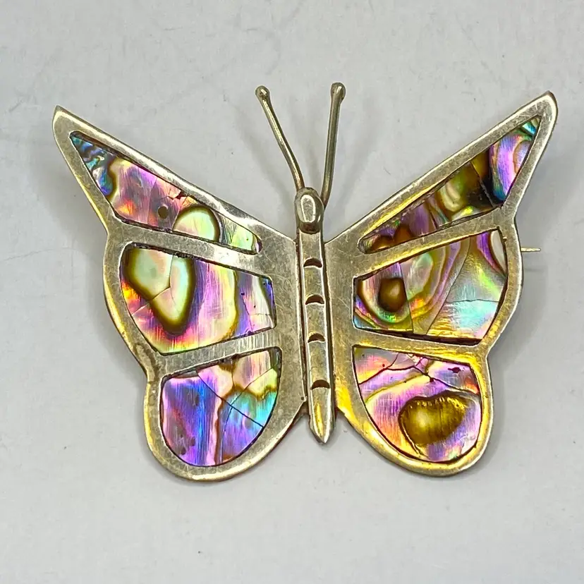 Vintage Mexican Sterling Silver Abalone Butterfly Brooch Pin 925 Taxco Style. This beautifully handcrafted brooch features vibrant natural abalone shell inlays set in solid sterling silver, forming an elegant butterfly design. The piece is marked "Mexico 925" with a partial silversmith’s mark, indicating it was artisan made, likely mid-20th century. The abalone wings exhibit iridescent hues of purple, green, blue, and gold, adding a striking natural shimmer. The pin mechanism is in good working condition. Light patina and minor wear consistent with age, including hairline fissures in the shell, do not detract from its display appeal. Please see pictures for detail.