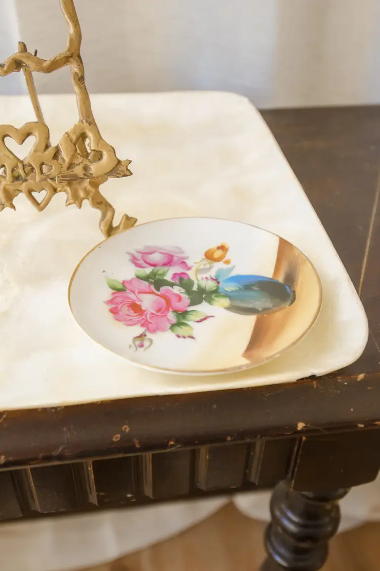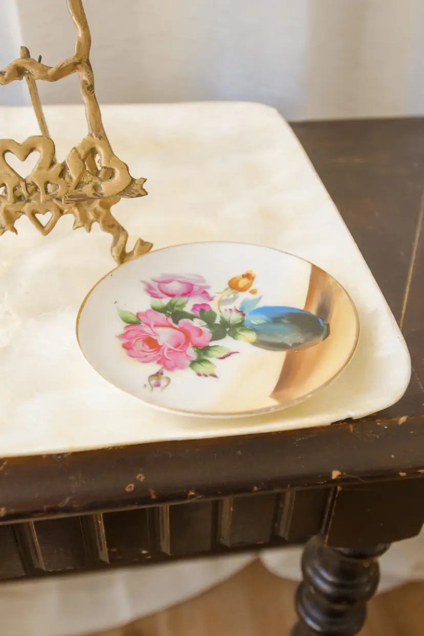 This vintage plate from Ucagco is a beautiful example of Japanese craftsmanship. The dish features hand-painted roses and other floral designs, making it a unique and eye-catching piece. It was made in Japan, and the quality shows in every detail. This plate is perfect for collectors or anyone who appreciates fine ceramics.