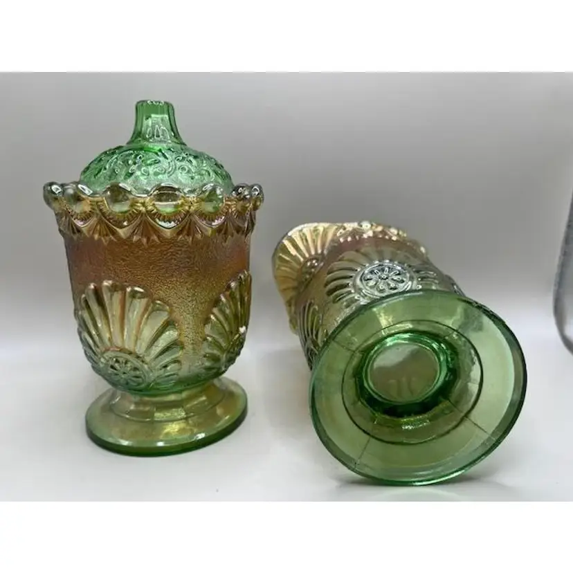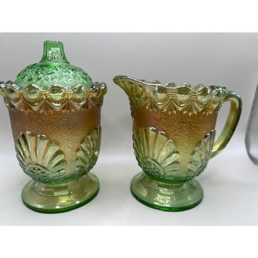 Add a touch of vintage elegance to your table with this stunning green gold carnival glass creamer and sugar set. The iridescent finish and intricate detailing make it a perfect addition to any collection or decor. Both pieces are in excellent condition.