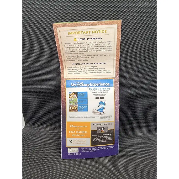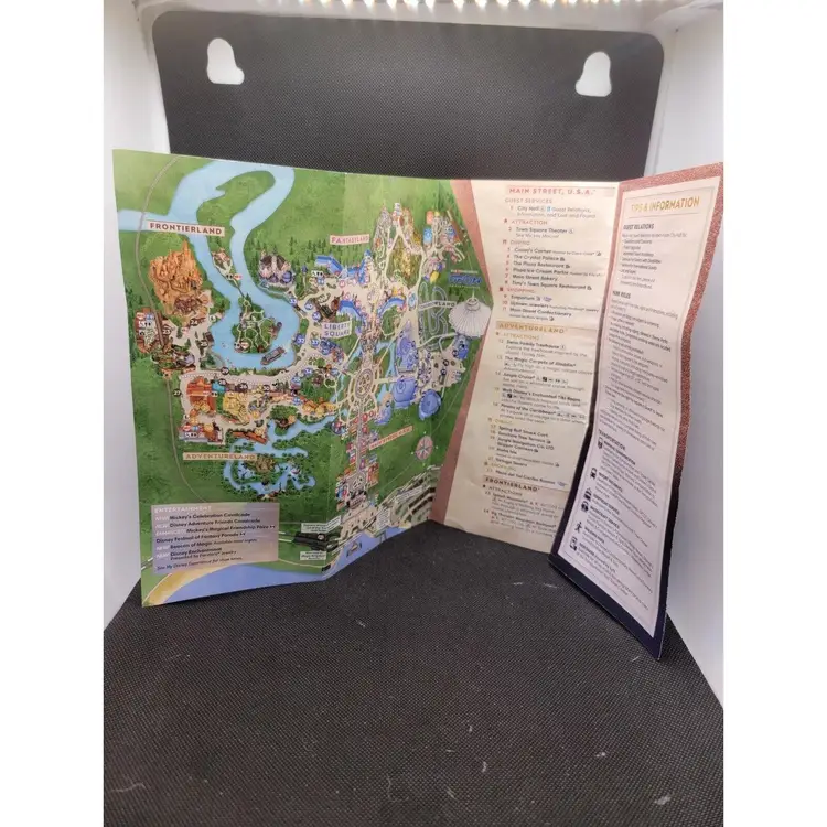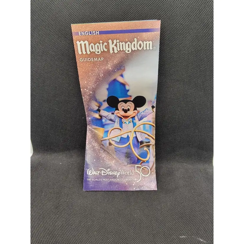 Preowned. Walt Disney World 50th Anniversary Magic Kingdom Guide map. Has some marks and dust from storage. Edges have signs of wear. Guide map. Magic kingdom.