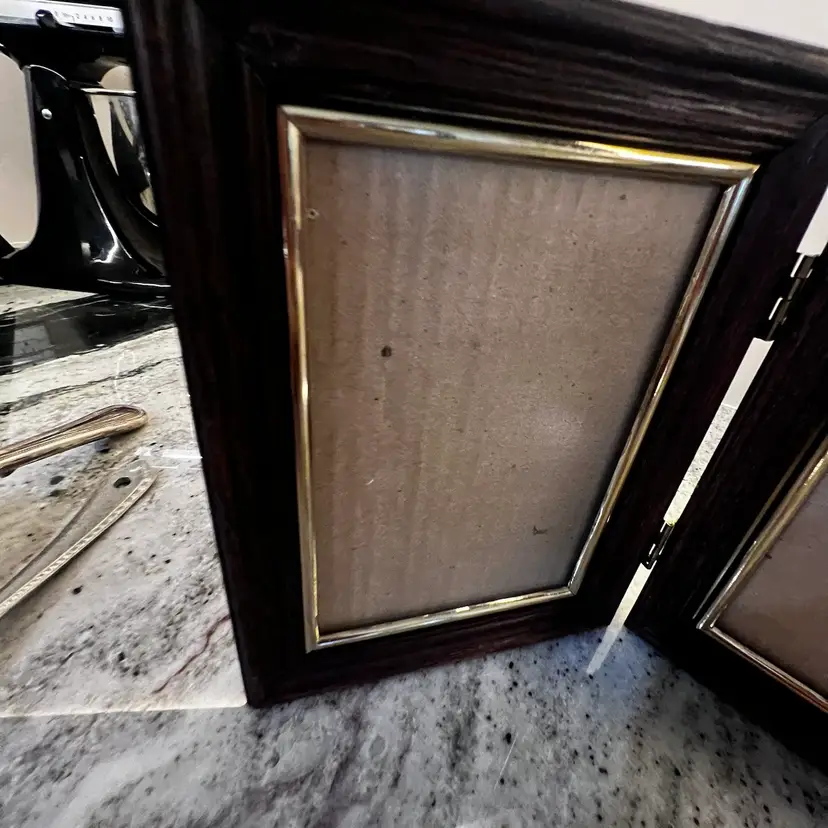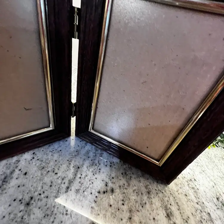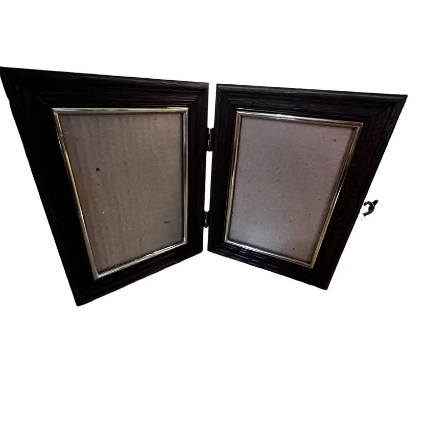 021 Vintage 70s Wood And Brass Double Picture Frame Decor