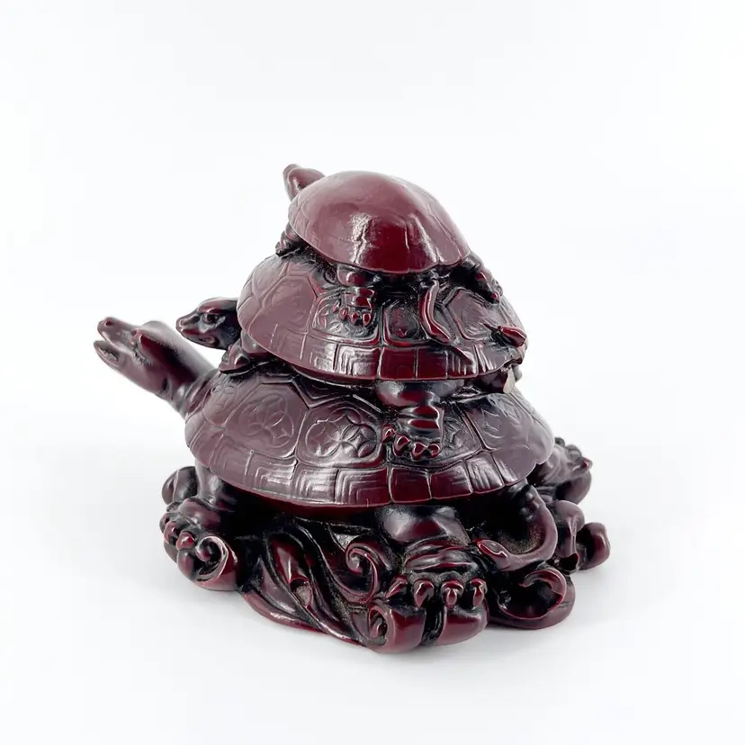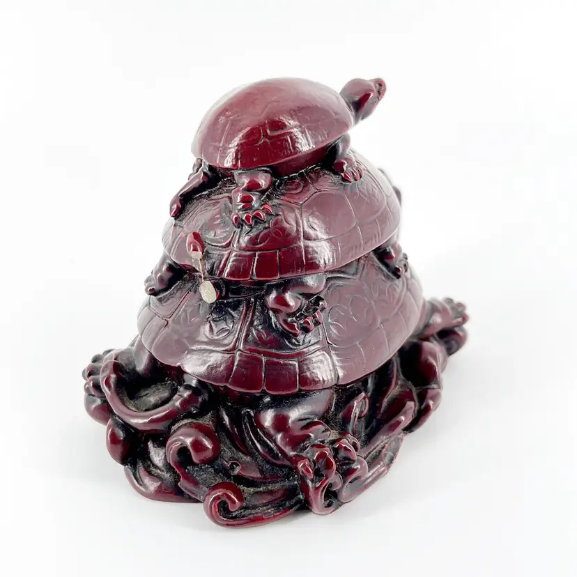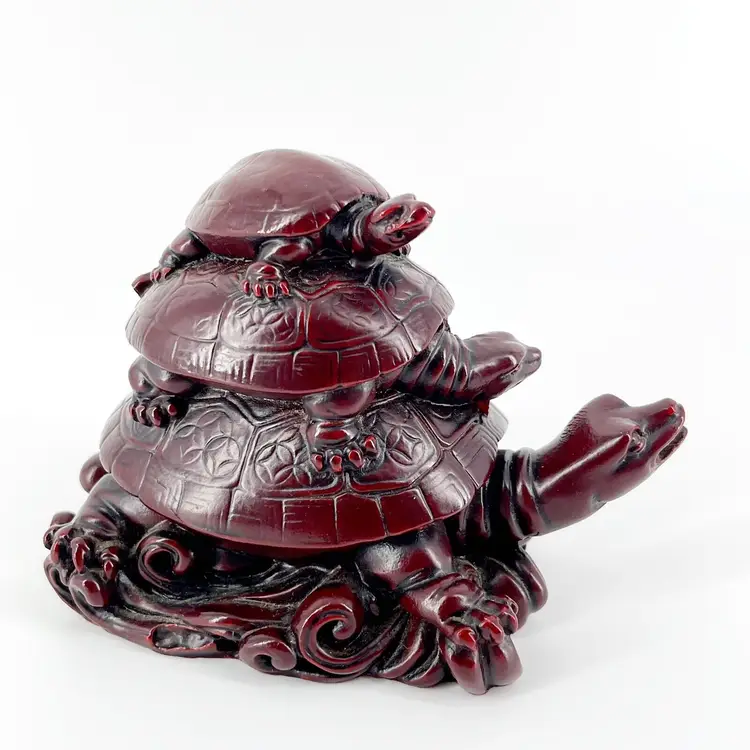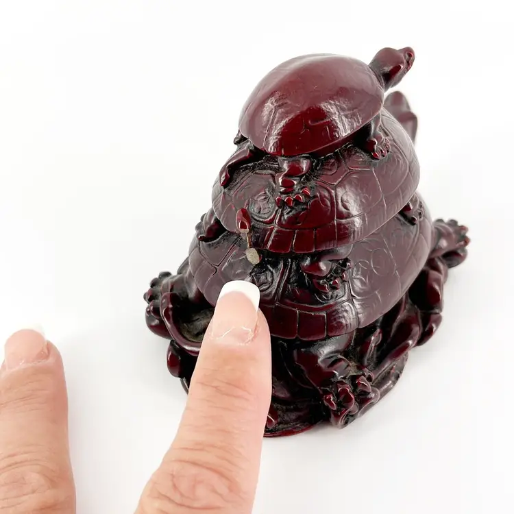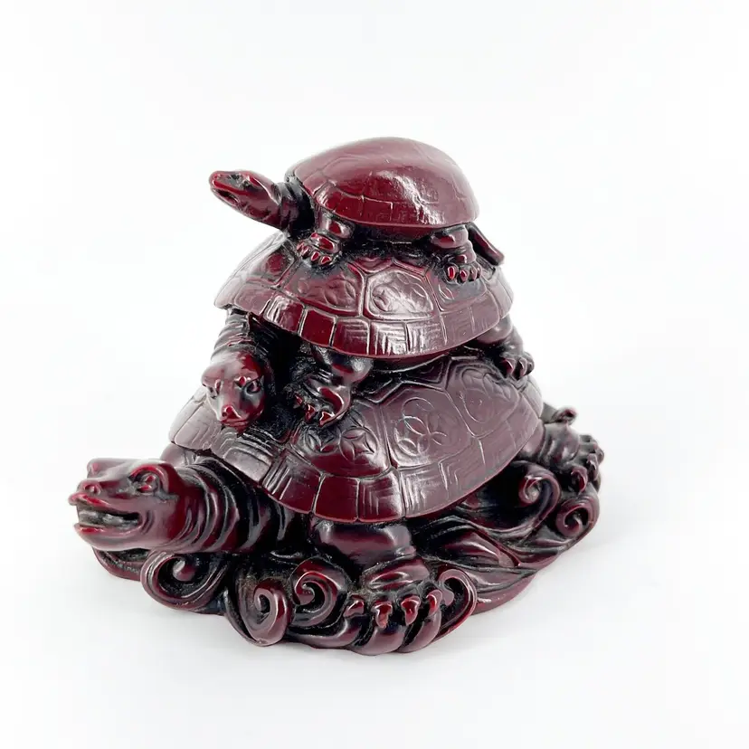 This whimsical resin figurine features 3 turtles stacked on top of each other. It is 3" tall and measures 4.5"x 3" and is in great condition. There are no cracks or repairs. One turtle's tail is missing. (See photos).
