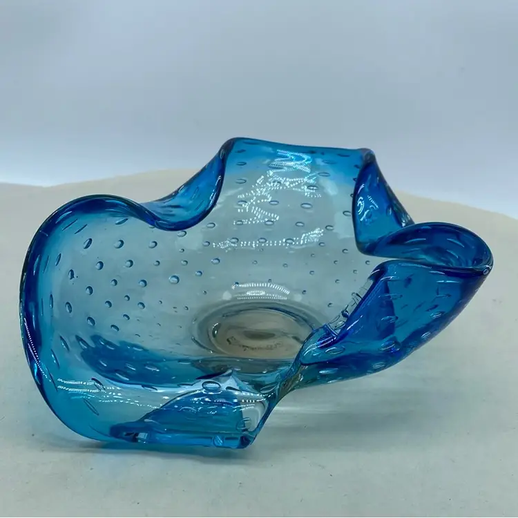 Skilled artisans carefully manipulate molten glass to achieve the desired bubble distribution and overall shape. The folded or ruffled edges, as seen in this piece, add an additional layer of artistic complexity, enhancing its visual appeal. Without definitive markings or provenance, it's difficult to attribute it specifically to Murano, but the style is certainly reminiscent of that tradition.