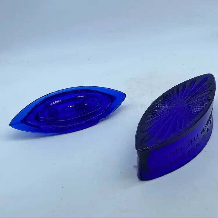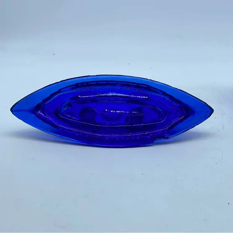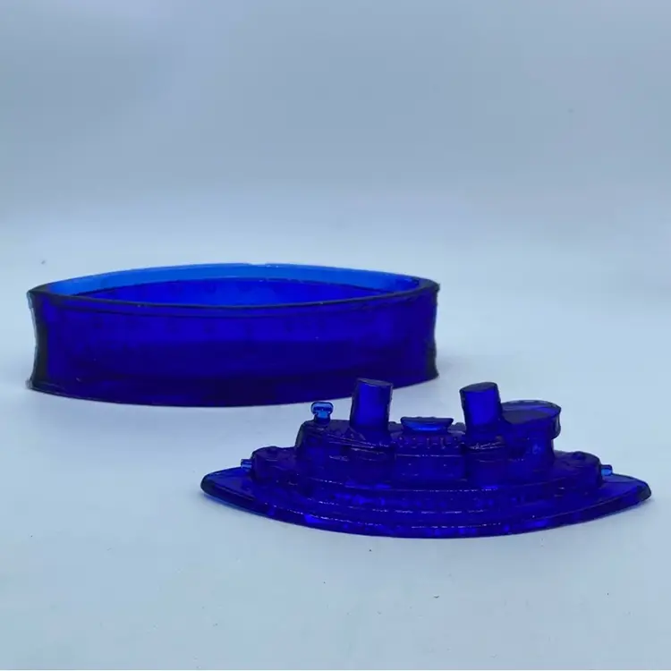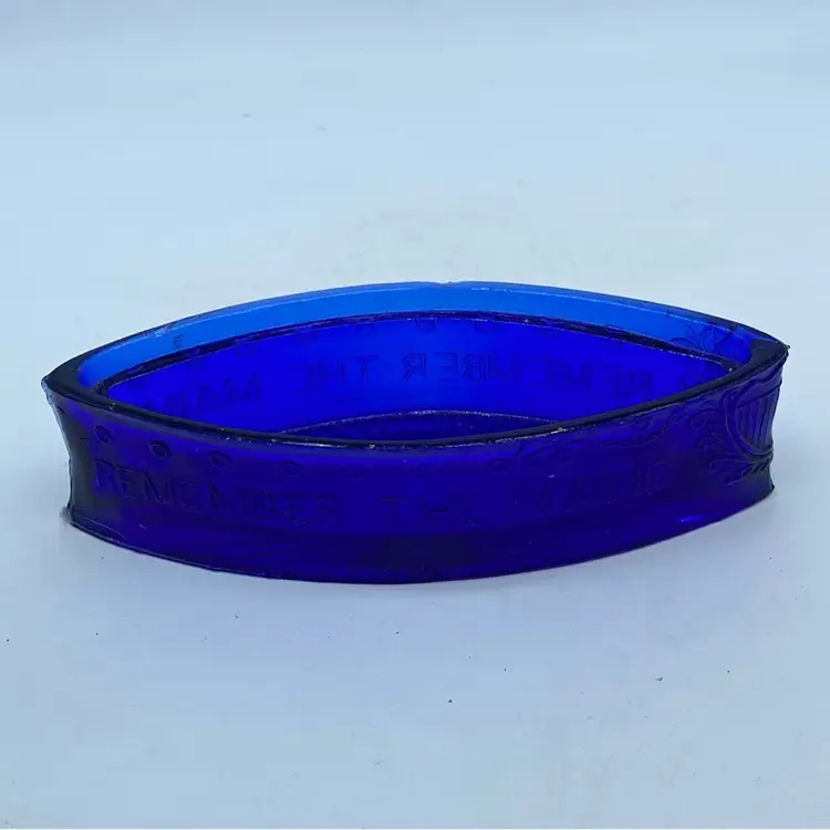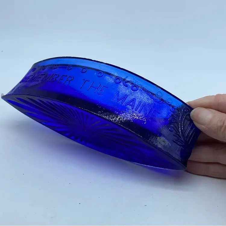 This glass ship is a commemorative item produced to remember the USS Maine incident. Such souvenirs were popular in the late 19th and early 20th centuries, especially following significant historical events. This particular piece, made of cobalt blue pressed glass, likely served as a candy dish or trinket box, serving both a functional and memorial purpose for those who wished to commemorate the event and express patriotic sentiment.
