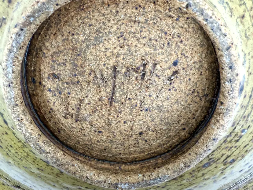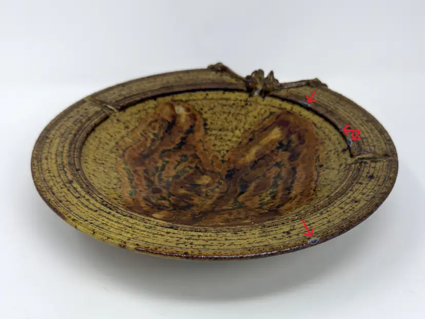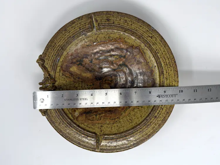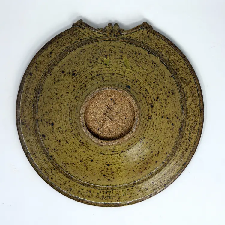 Details: • Handmade studio pottery • Mottled olive, rust, brown glaze • Sculptural rim with rests • Signed on base (incised cursive) • Diameter: 10" | Height: 1.75" | Weight: 1 lb 7 oz • Condition: Fair to good—small edge chips, no cracks