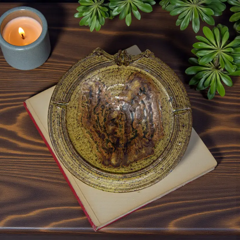 Bring earthy style to your space with this large handmade stoneware ashtray. Crafted in the USA during the 1970s, it features rustic olive and brown tones with a sculptural rim and notched rests. The base is signed (“Mil…”), showing true artisan work.