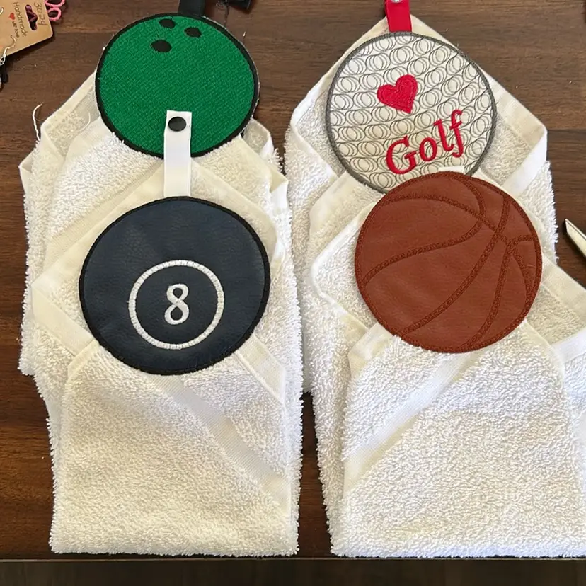 Pool, bowling , basketball and golf towels. Your choice. Towel measures 12 by 12 inches.