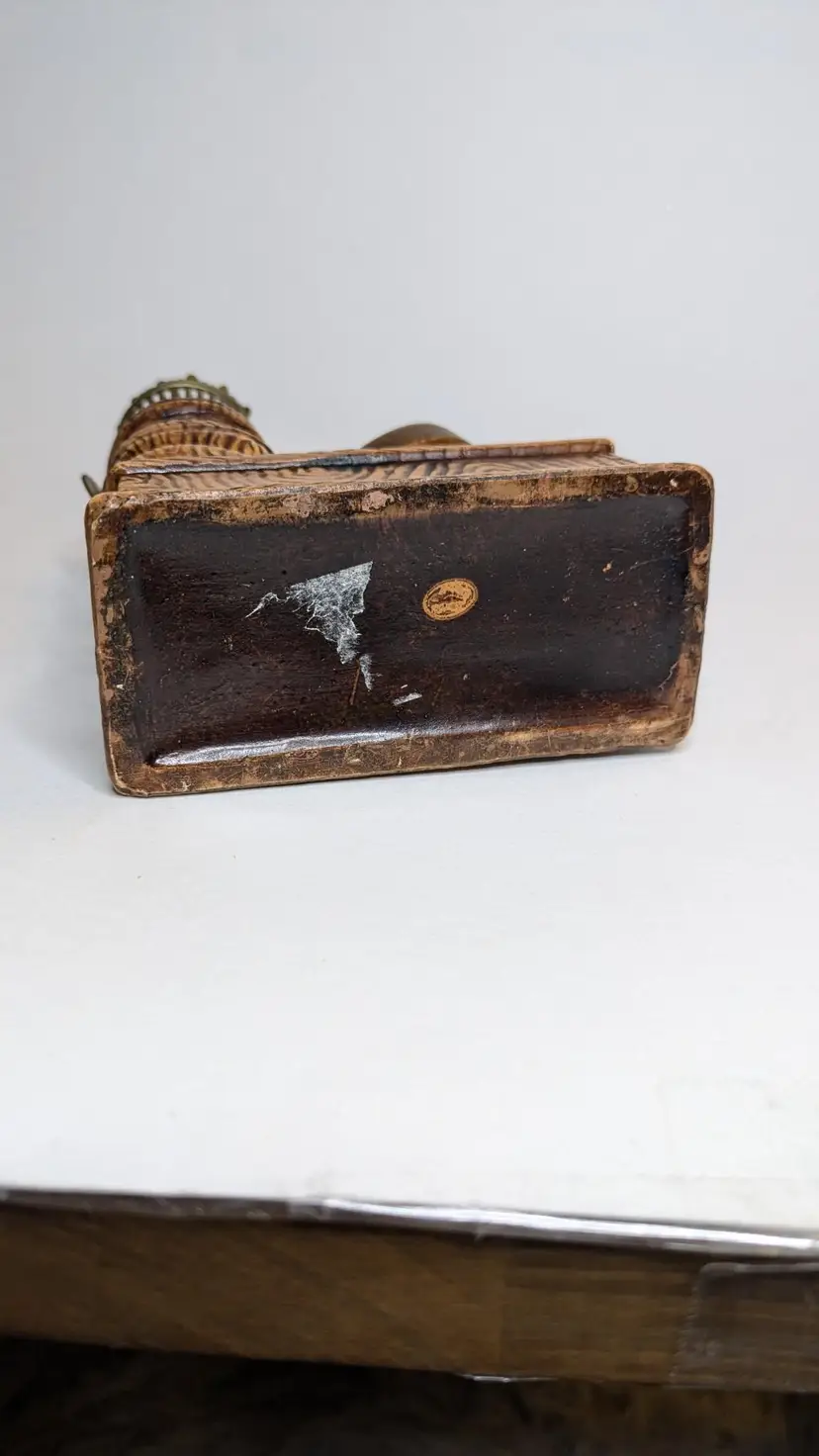 Shows light wear, age, and very light chipping. Not sure if porcelain or chalkware. Cool piece!