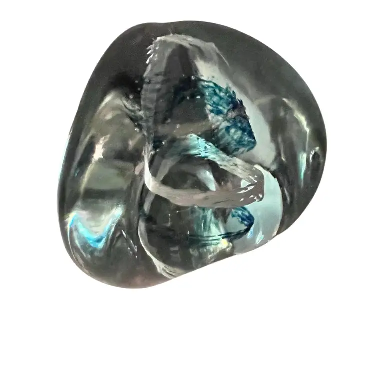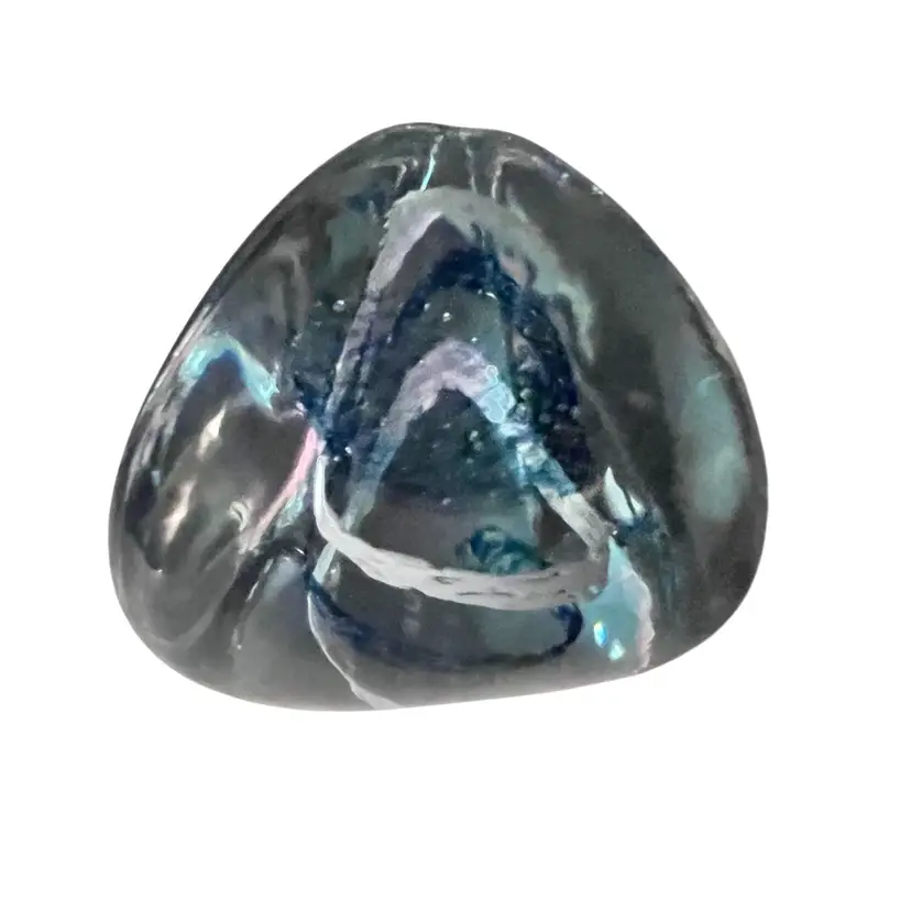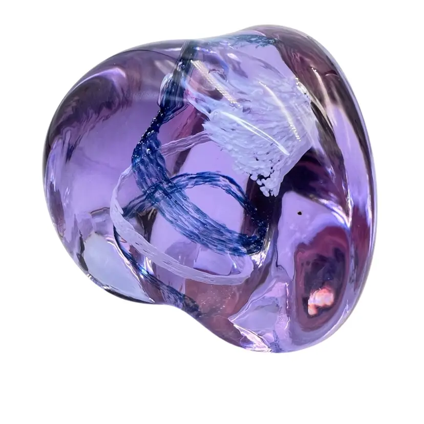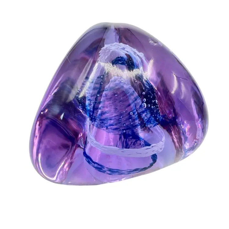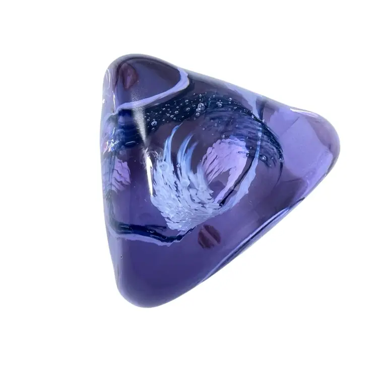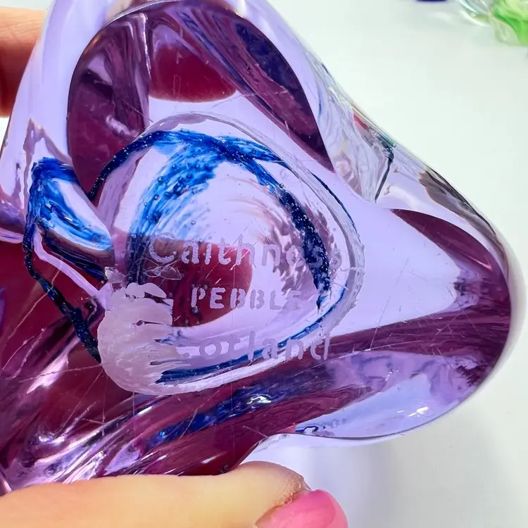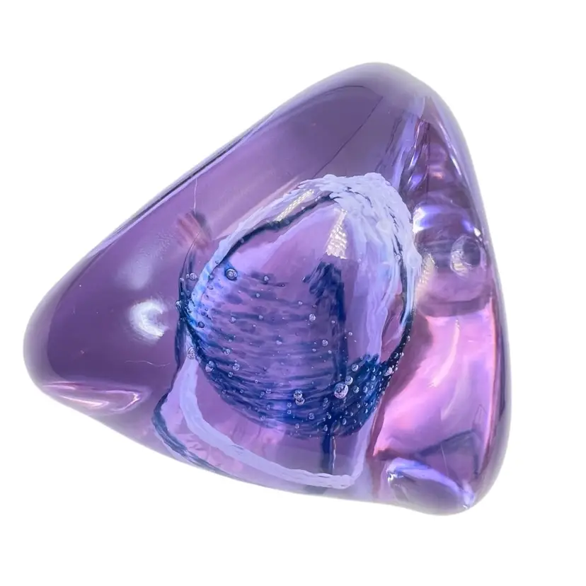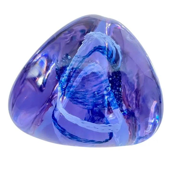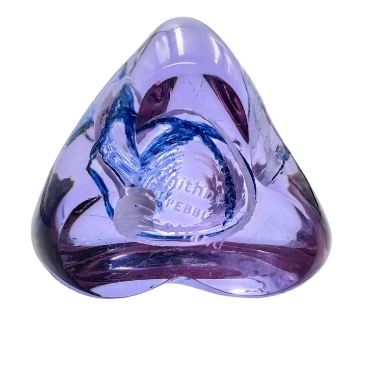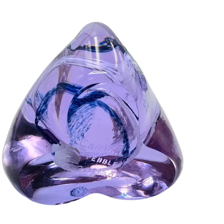This Caithness is a smooth beauty. Its organic shape is from her “Pebble” series. A wonderful clear lavender color that turns blue in lower light - neodymium (see photos). A corkscrew swirl of blue and white glass inside. Etched signature Caithness PEBBLE Scotland. No chips, cracks or bruises. Some vintage wear scratches on the bottom.