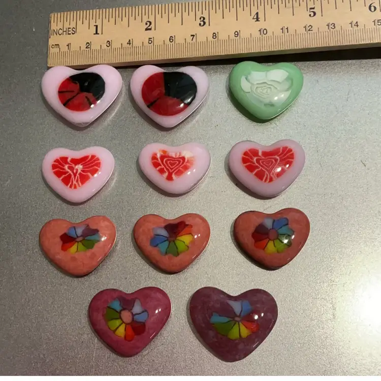 Mini fused glass heart, kiln made with love by me! Each heart is unique and varies in color placement, bubbles and depth of field. Shiny on the front, textured on the back, approximately 1 x 1 1/4-inches. Made with Bullseye glass and elements from other glass artists.