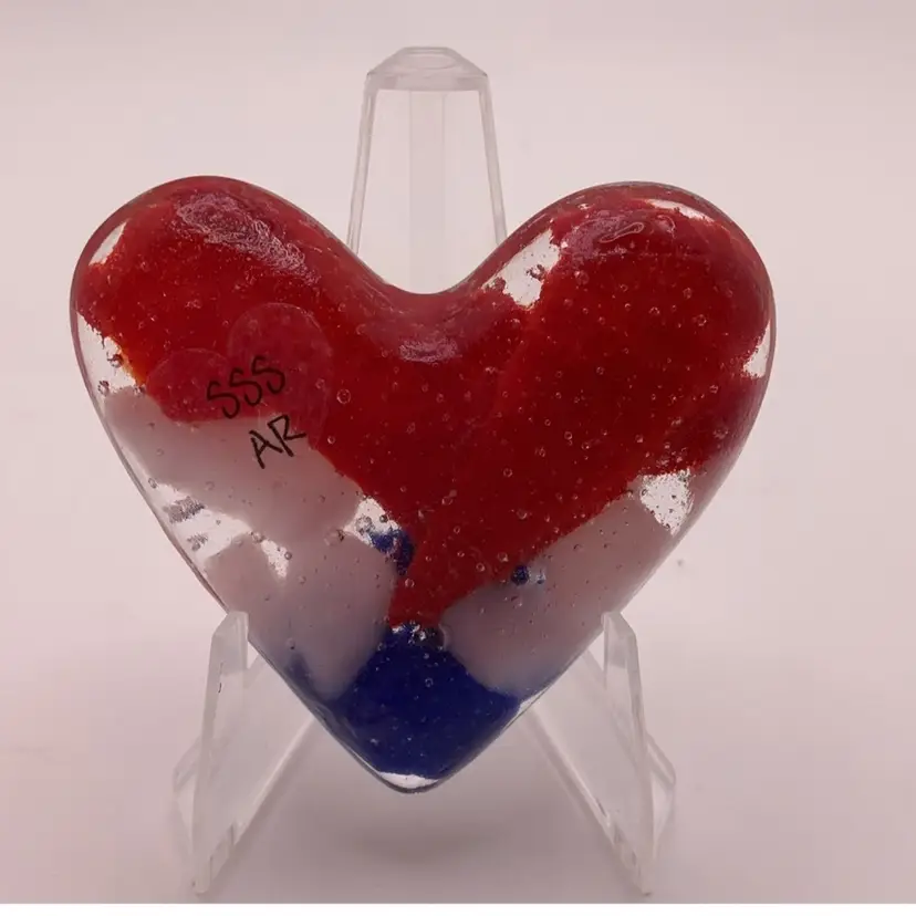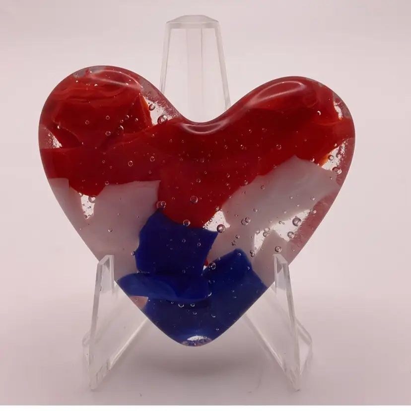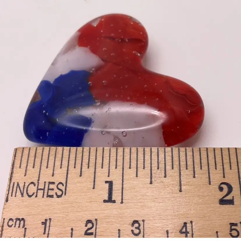Small, fused glass heart, kiln made with love by me! Each heart is unique and varies in color placement, bubbles and depth of field. Shiny on the front, textured on the back, approximately 1 3/4 x 1 3/4-inches. Made with Bullseye glass.