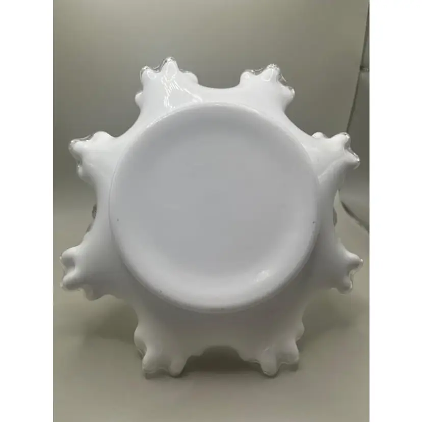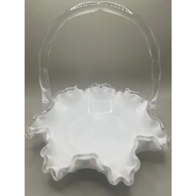 Add a touch of vintage elegance to your home with this Fenton silver crest glass basket. Perfect for display or as a unique centerpiece, this basket features a beautifully ruffled edge and a sturdy handle. Condition: Excellent vintage condition with no visible wear. Size: Approximately 7.25 inches tall.