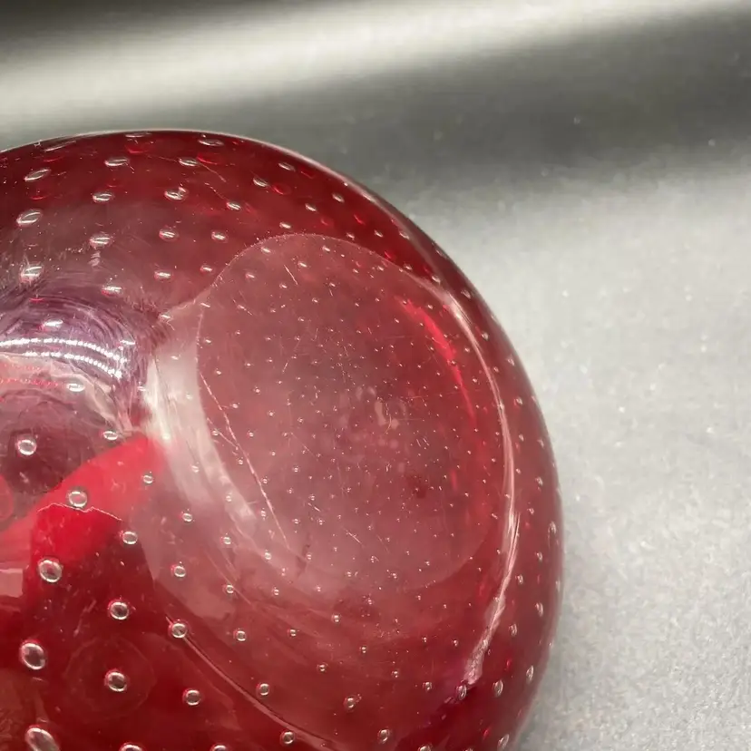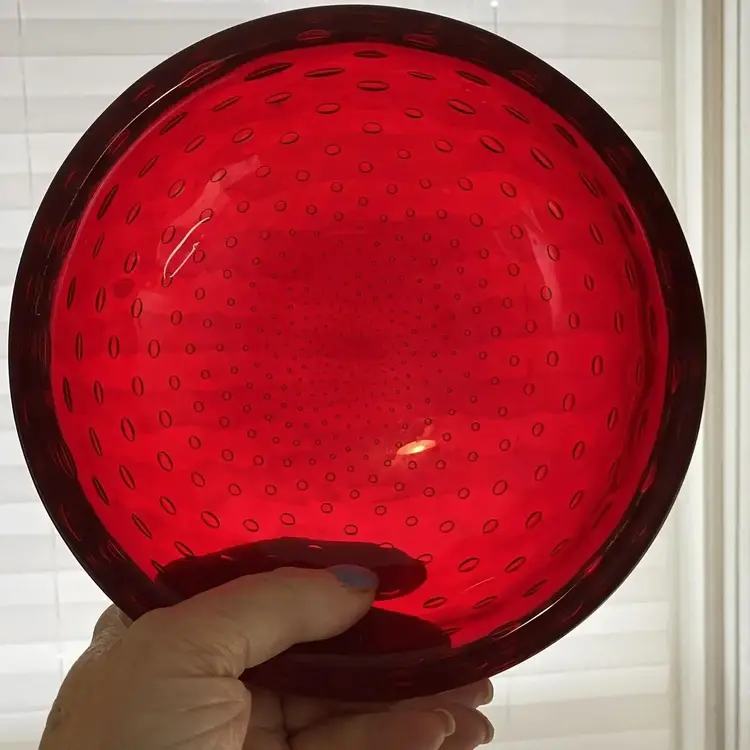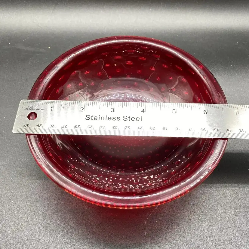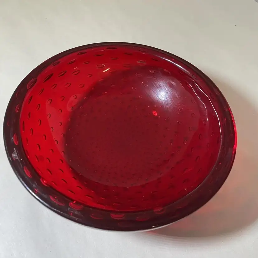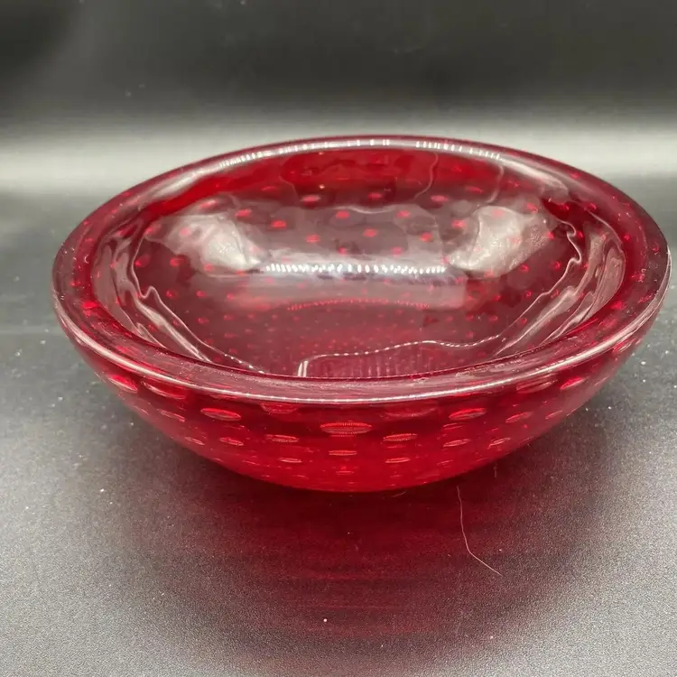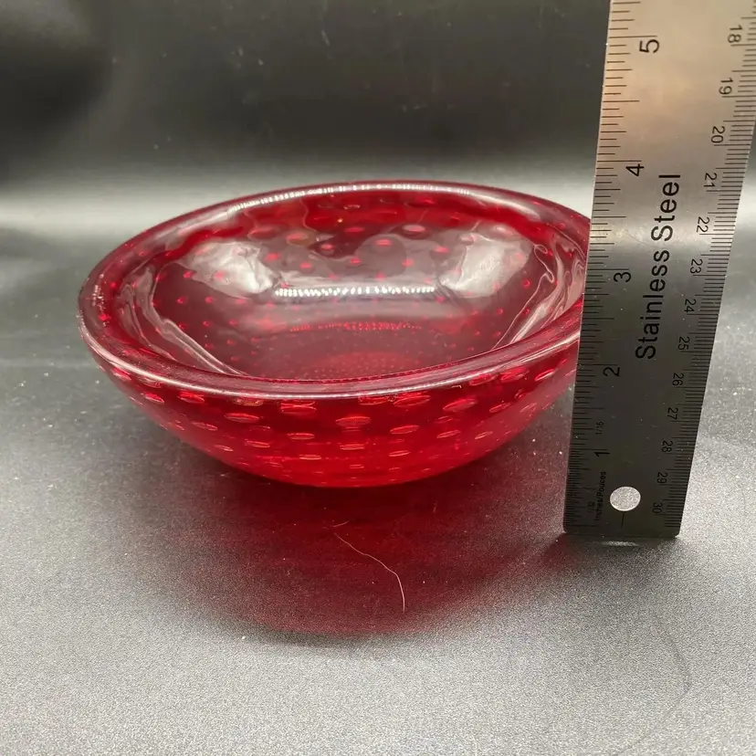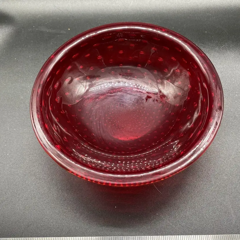 This vintage Murano art glass bowl is a stunning addition to any collection. Made from ruby red art glass with controlled bubbles (Bullicante) in a graduated swirling pattern, this 7-inch bowl is a true work of art. The Murano brand is known for their high-quality glass products, and this bowl is no exception. Crafted using traditional production methods.It's perfect for display or for use as a decorative piece in your home. This piece of decorative glass is sure to impress. Add a touch of elegance to your home with this beautiful Murano art glass bowl.