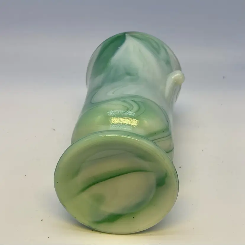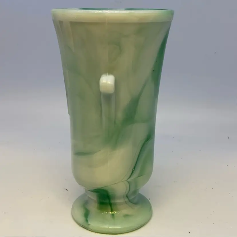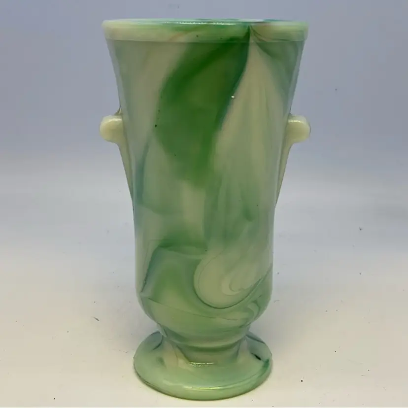 Slag glass, also known as marble glass, is created by adding metallic oxides to molten glass, which then cools and swirls to create unique patterns. Akro Agate's slag glass items, like this vase, are highly sought after by collectors for their distinctive marbled appearance and the variety of color combinations. The company ceased operations in 1955, making its vintage pieces collectible.