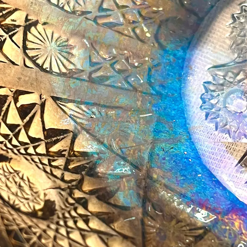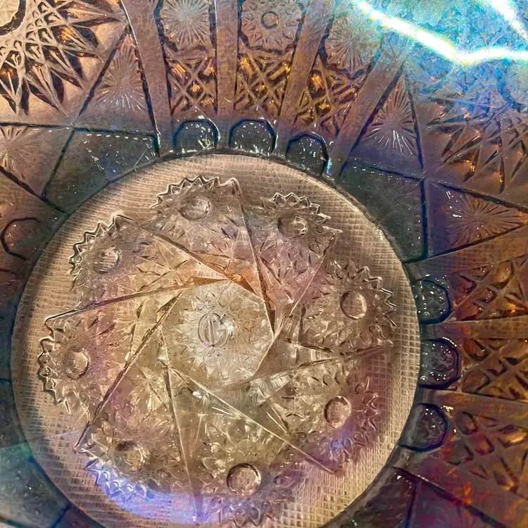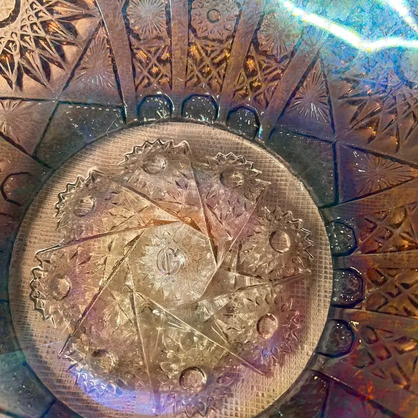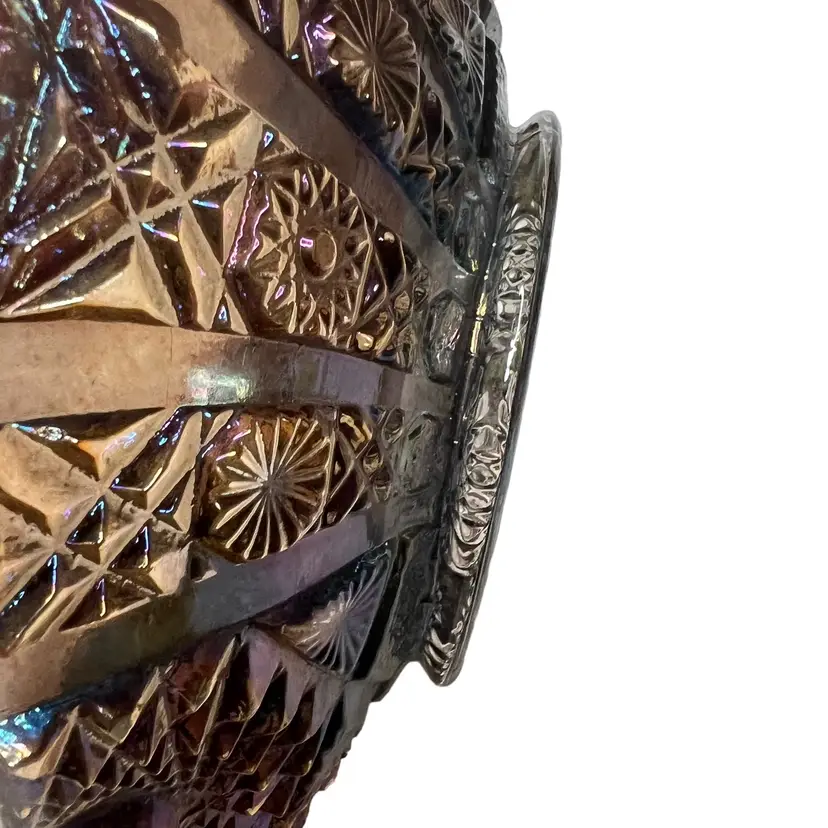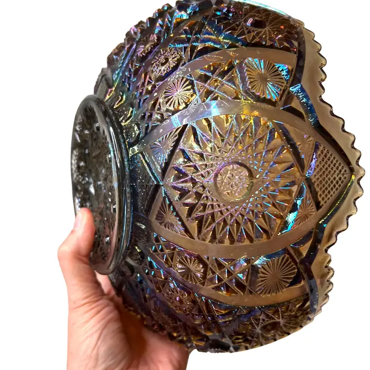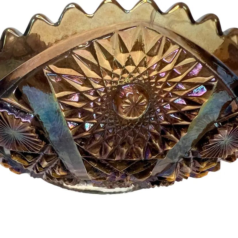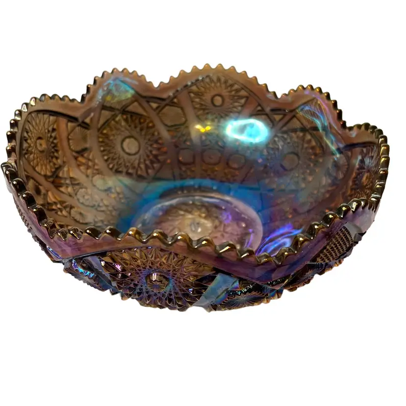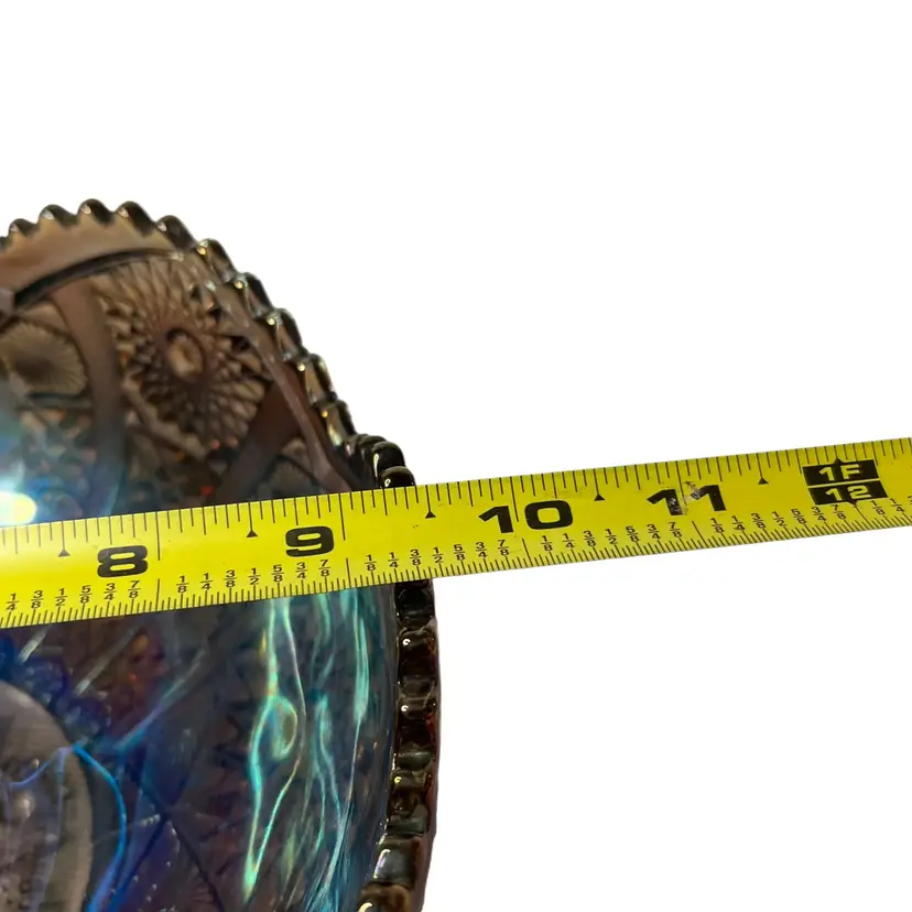This vintage Imperial Glass console bowl features a beautiful diamond and starburst hobstar design in a unique smokey blue carnival glass. The bowl was made in the United States and is a post-1940 original piece. The brand is Indiana Glass and the primary material is glass. The style of this bowl is Mid-Century Modern and it is perfect for any collection of decorative collectibles. The bowl is in excellent shape and has no visible signs of wear or damage. This is a great addition to any home decor or vintage glass collection. No Chips or cracks or crazing measures 9.5 x 4" Please look at photos carefully, and ask questions before buying. Thank you for looking Simply Old Stuff Check out the Simply Old Stuff store