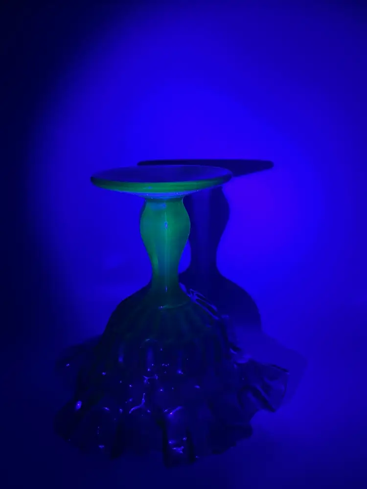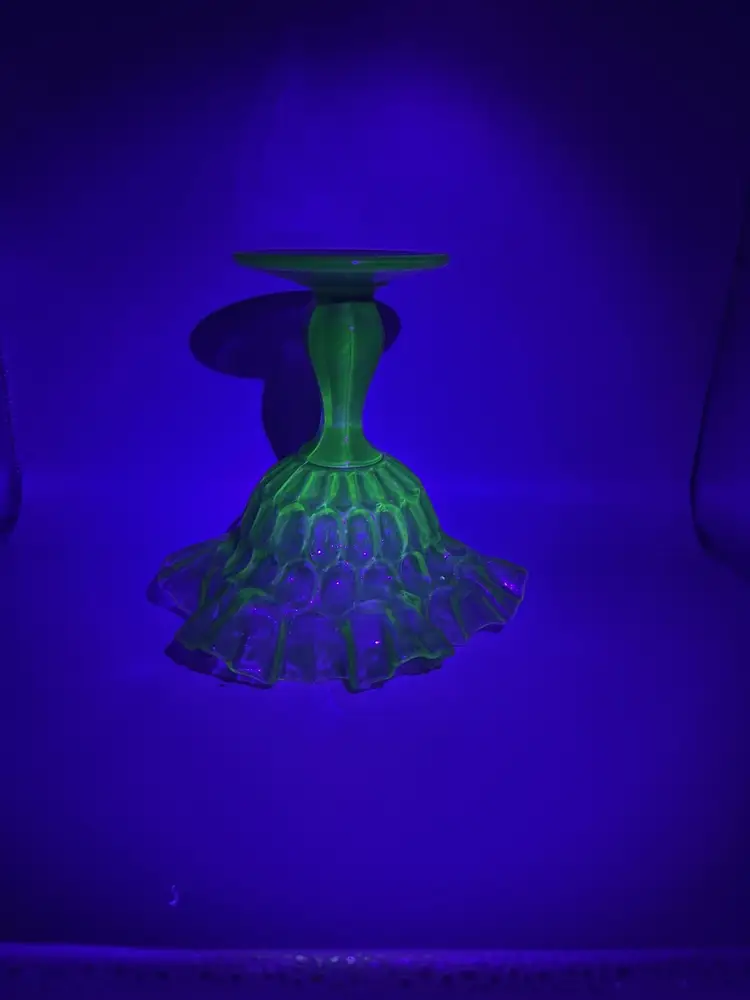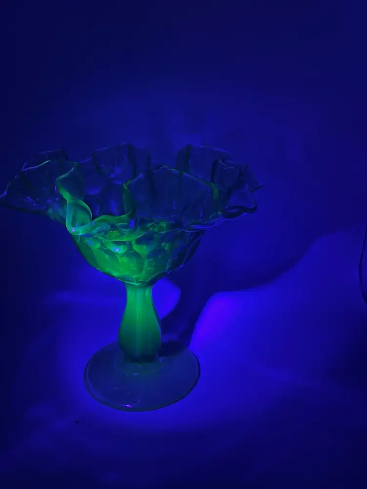 Add a touch of vintage charm to your decor with this beautiful olive green Fenton glass compote. Fluorescent under black light, as shown in pictures! Its pedestal base and intricate pattern make it a standout piece for any collection or as a centerpiece. In excellent condition with no chips or cracks. Measures approximately 6 inches tall and 6 inches in diameter.
