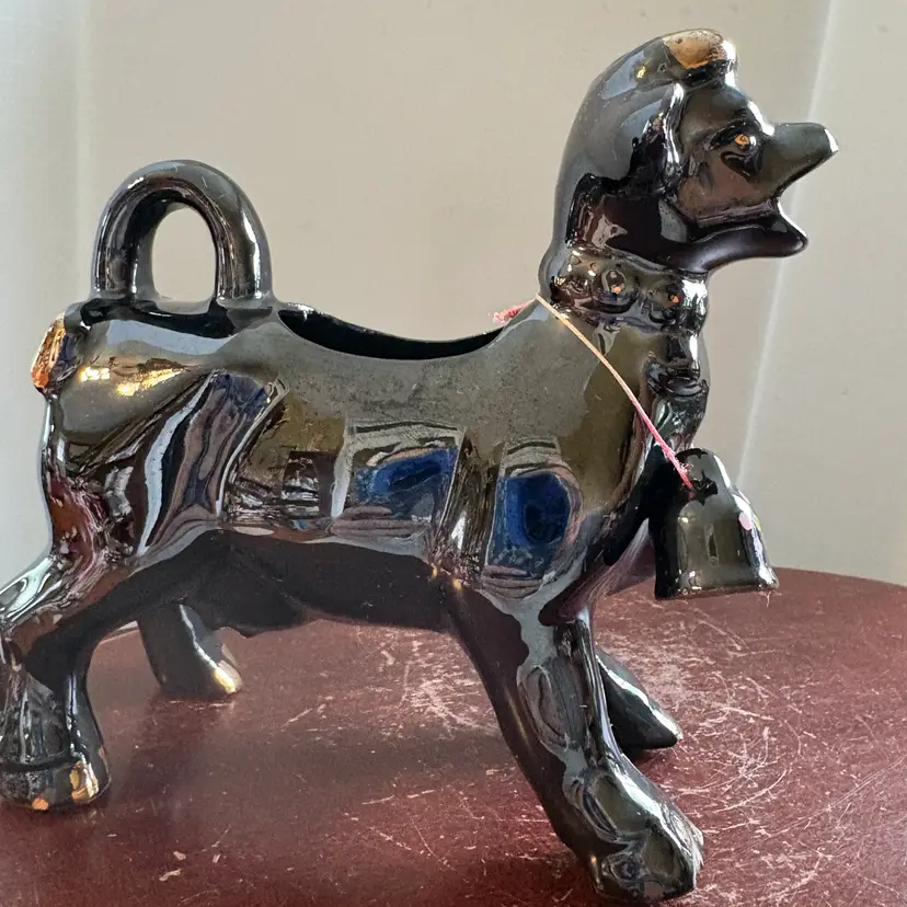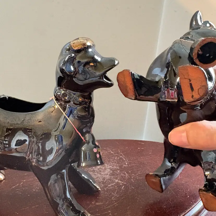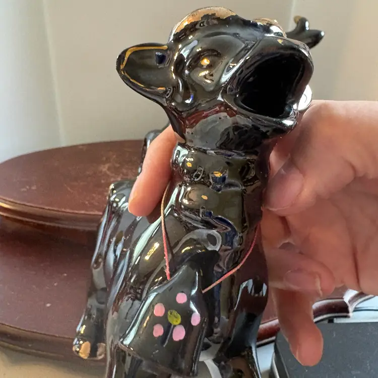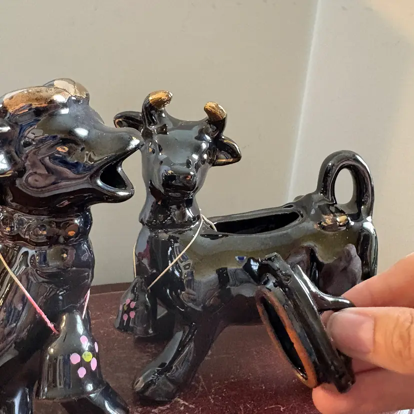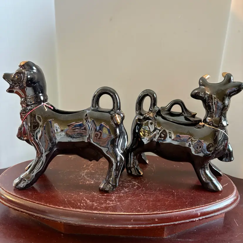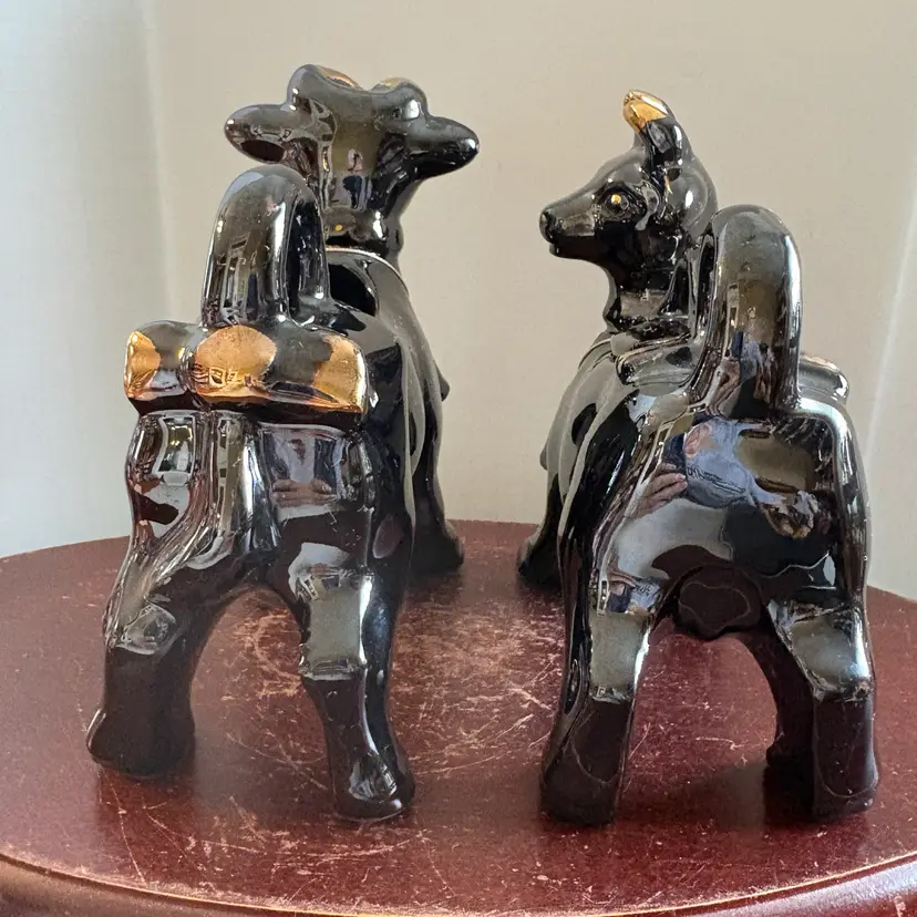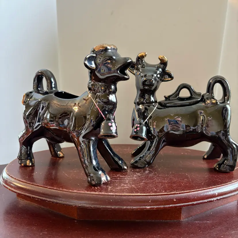 Black with gold trim, both have bells. No chips or cracks. 5” long and 5.75” tall
