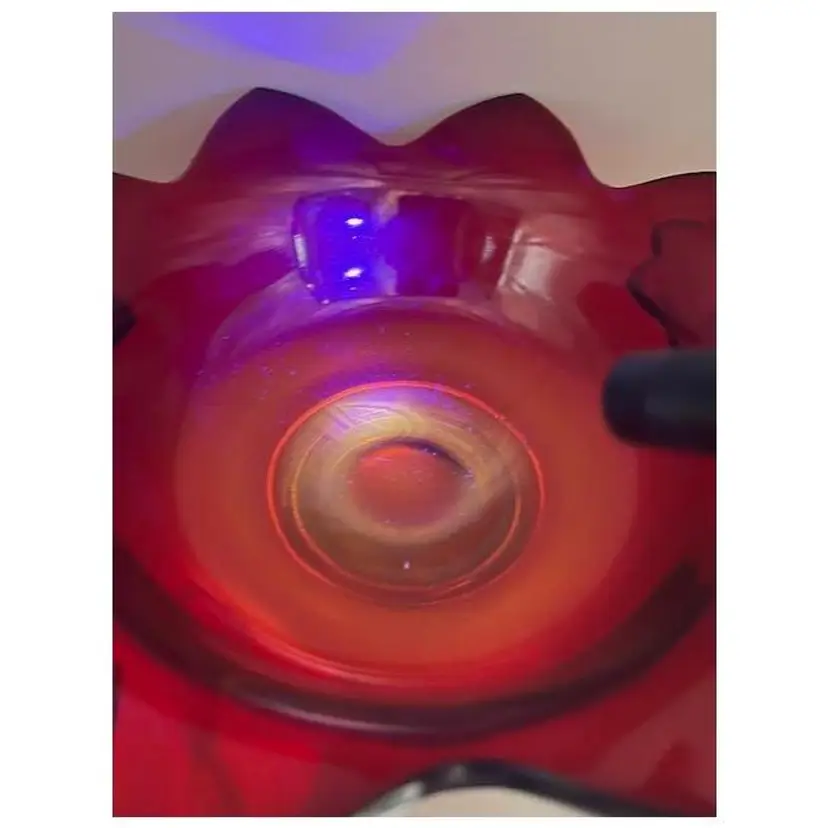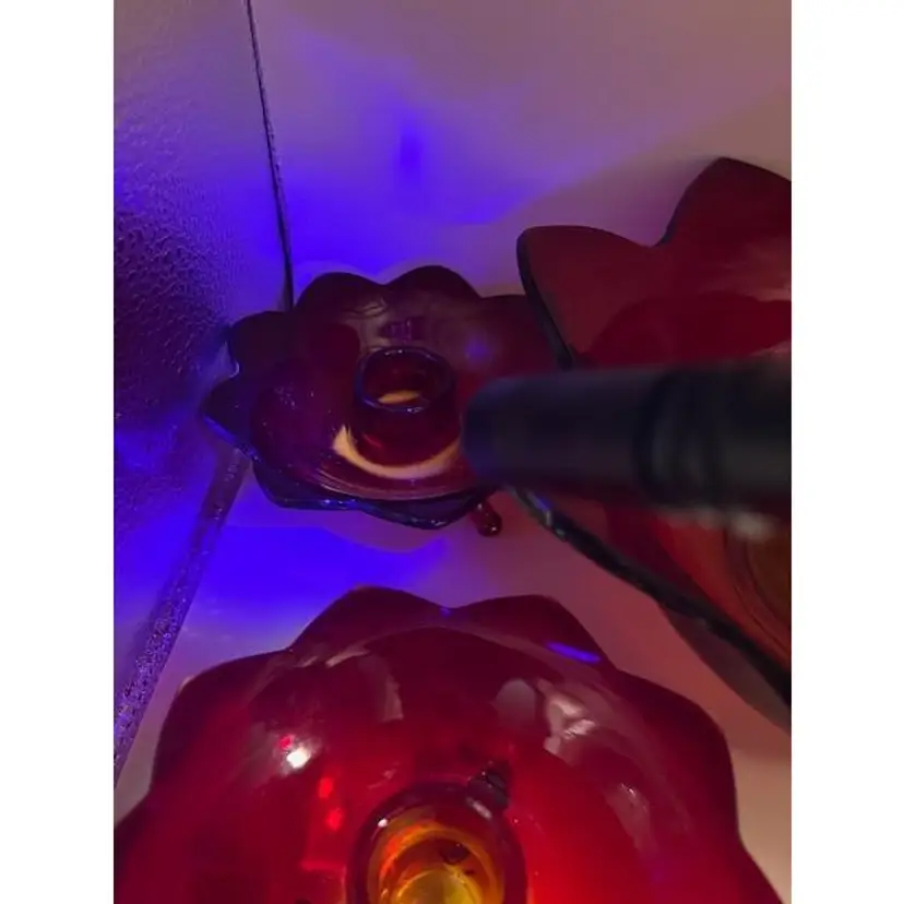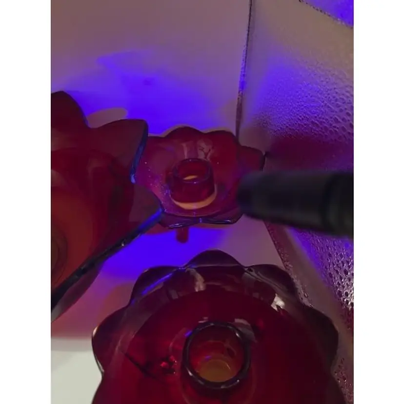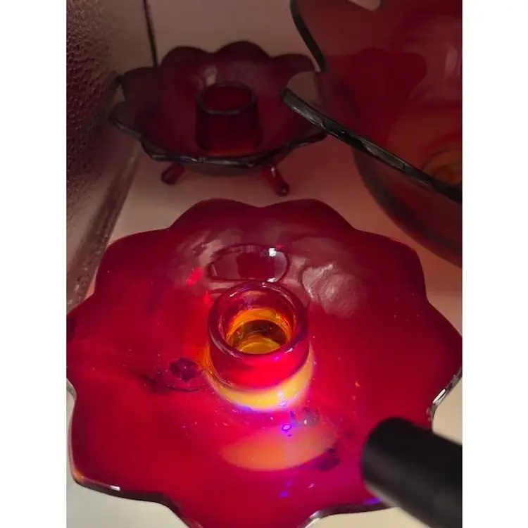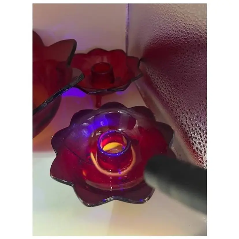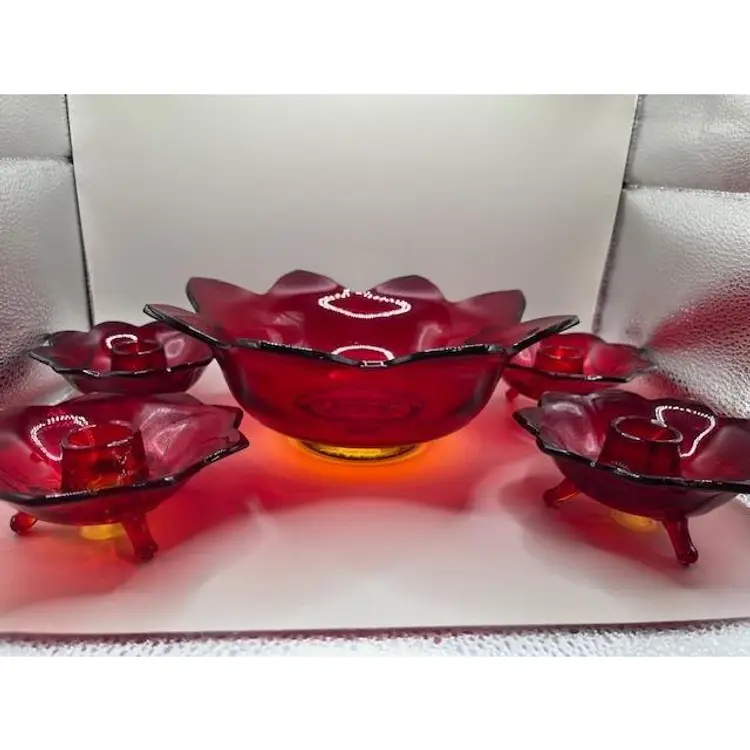 Add a pop of color to your table with this stunning vintage ruby red glass bowl and 4 candle holders set. Featuring a large flower-shaped bowl and four matching smaller bowls, this set is perfect for serving or display. Excellent condition with vibrant hues.