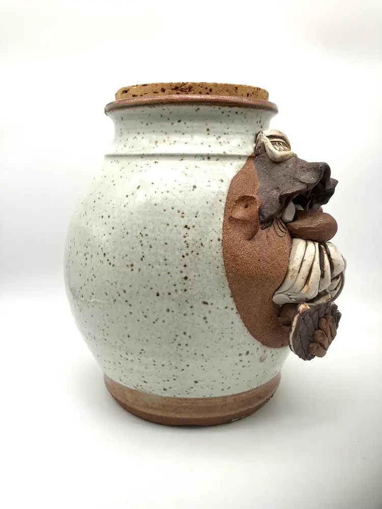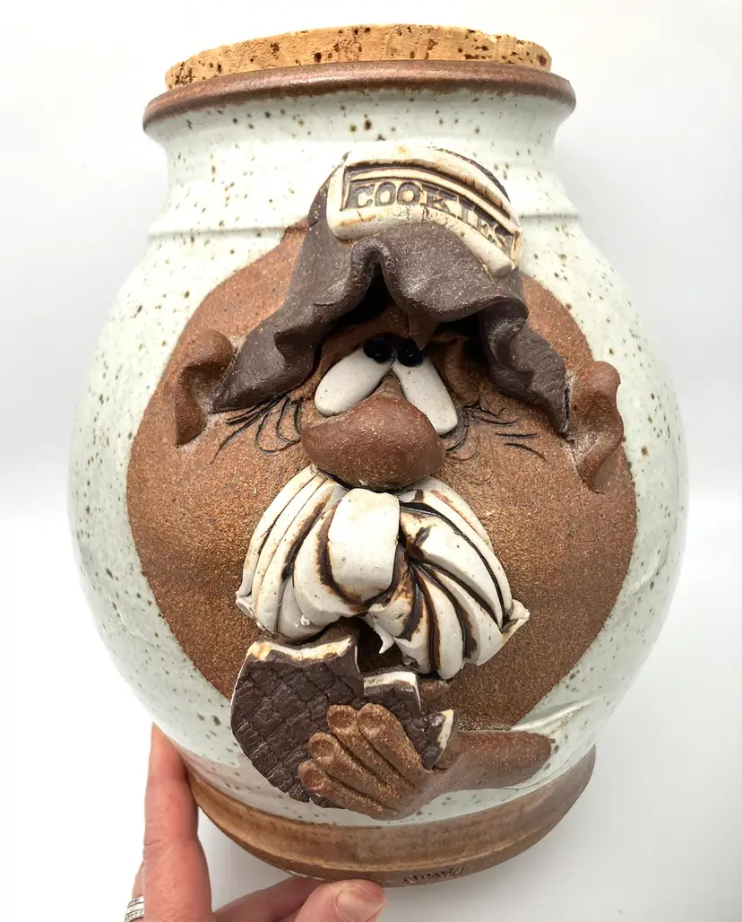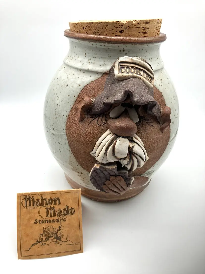Excellent condition! Still has original insert. Weirdo man with mustache eating cookie with clay icing dripping from mustache. Too good! MMS was Made in CA in 1970s and 1980s. Measures 9.75” high by 9.5” wide back to front including face and 8” side to side diameter.