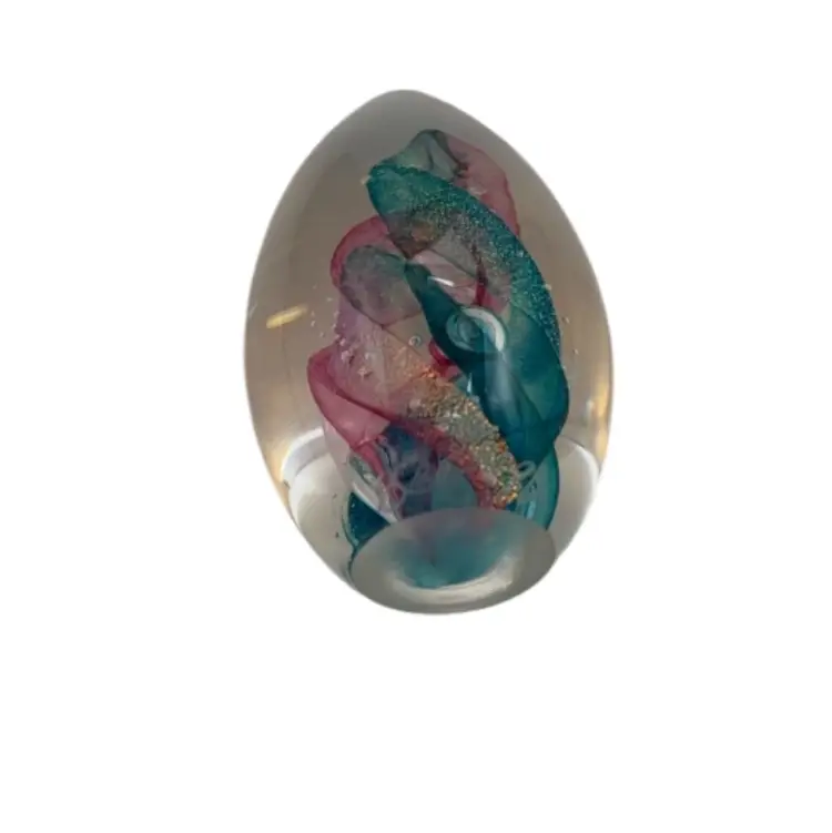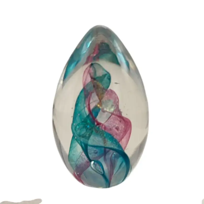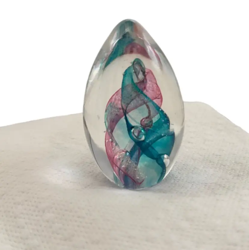 Black Sheep Glass BSG 1996 Signed Dichroic Shimmer Aqua & Pink Helix Swirl Egg Paperweight - 2.5”