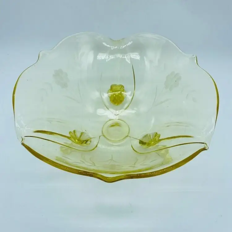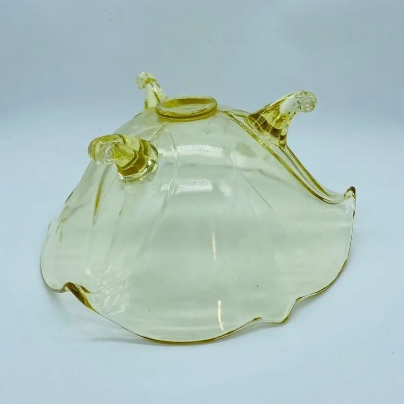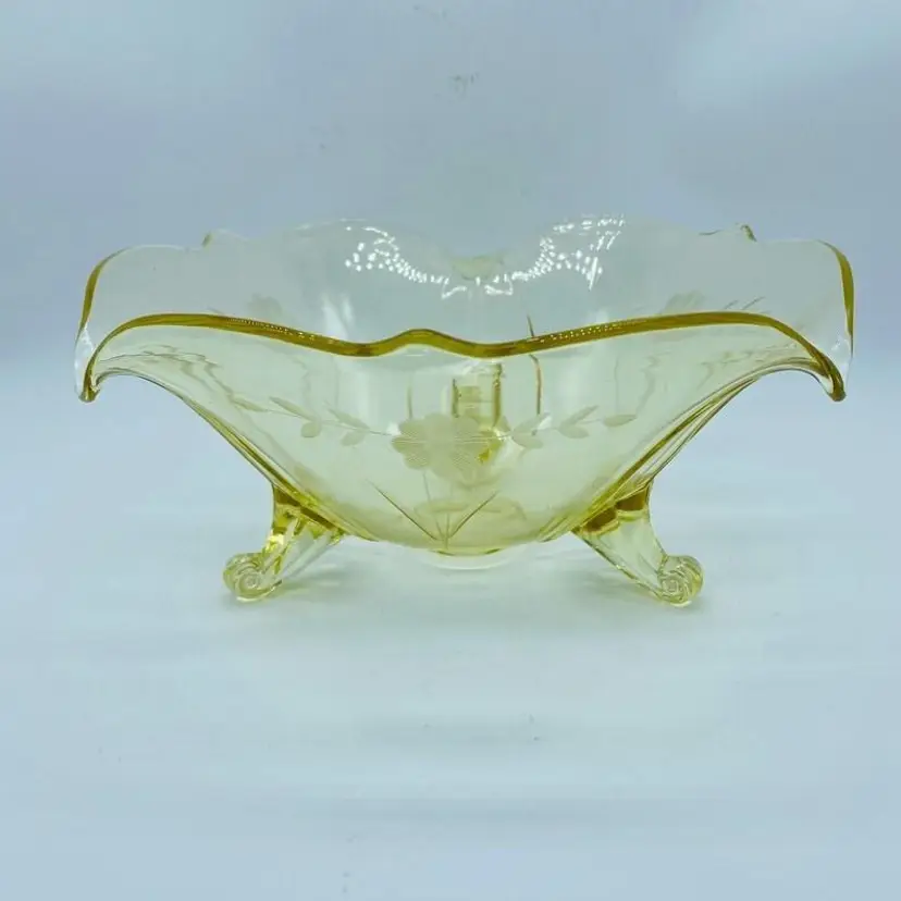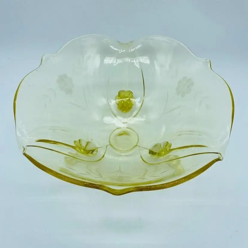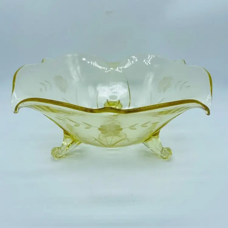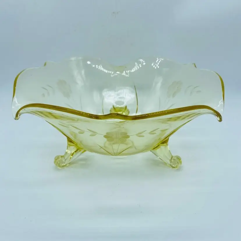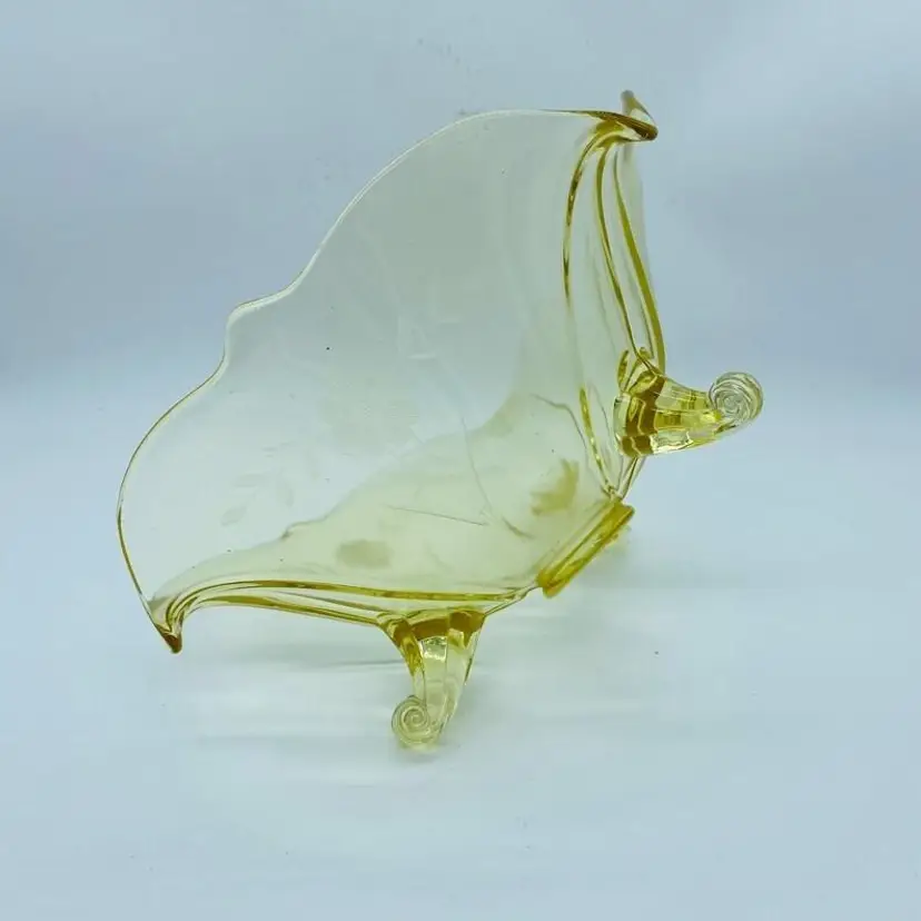 Vintage Lancaster Glass 3-Footed Bowl Petal Pattern Topaz Elegant Glass 8.5" -Beautiful bowl stands on 3 toes, formed into a tight curl -Graceful arch with fine, scalloped detail around the rim -Clear pale yellow topaz -Petal pattern -Lancaster Glass operated from 1908-1937 -Lancaster was known for Elegant Glass, -Condition is excellent, not a chip or a flea bite -Measures 8-1/2" wide, 3" deep and is 3-3/4" tall -Circa the 1930's