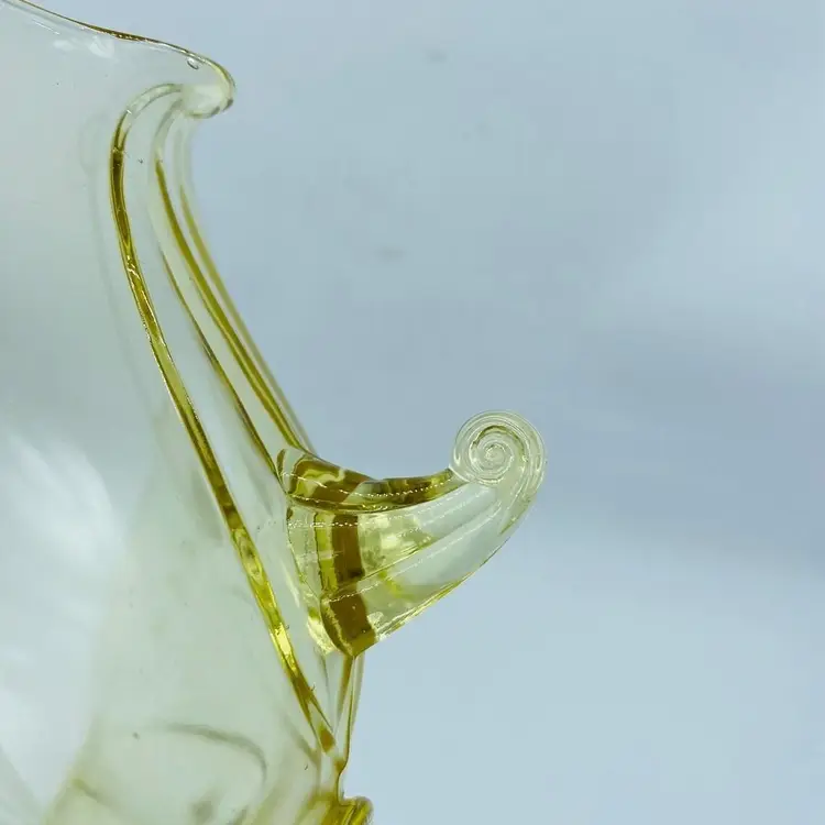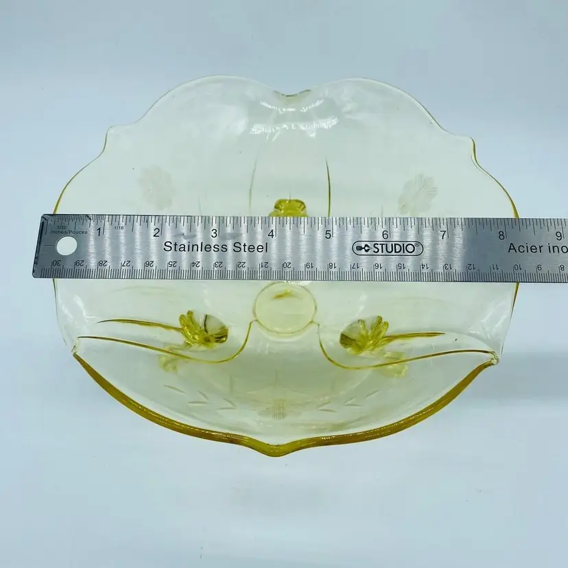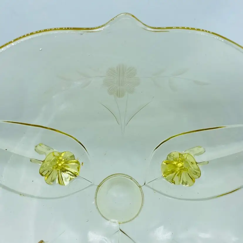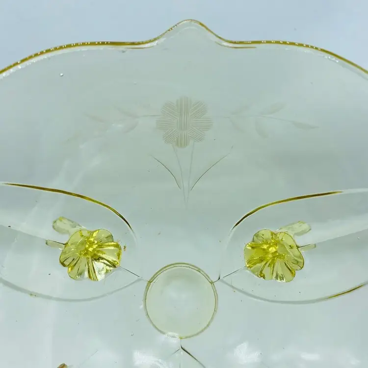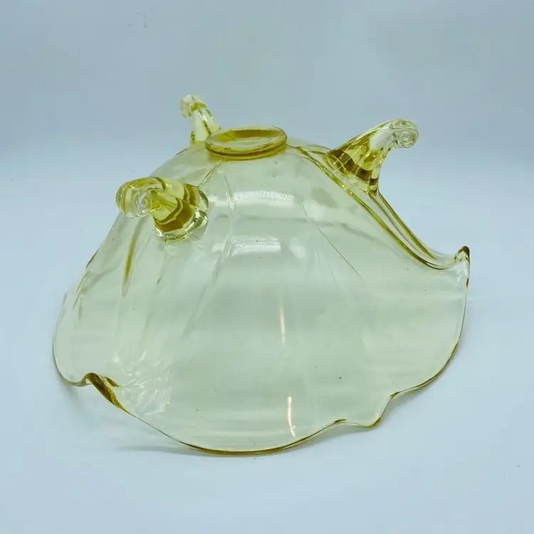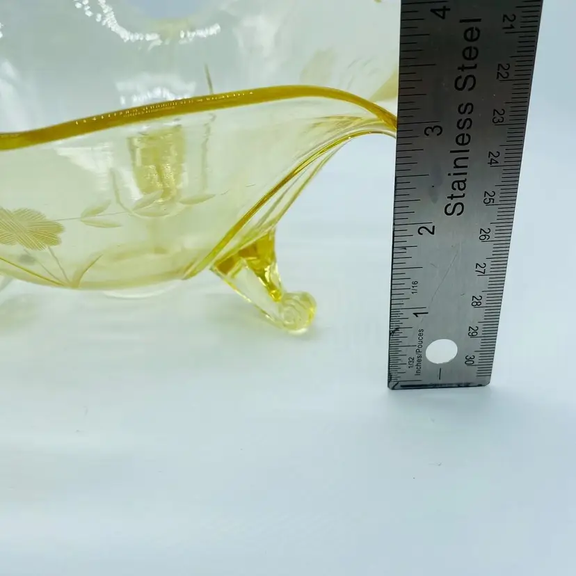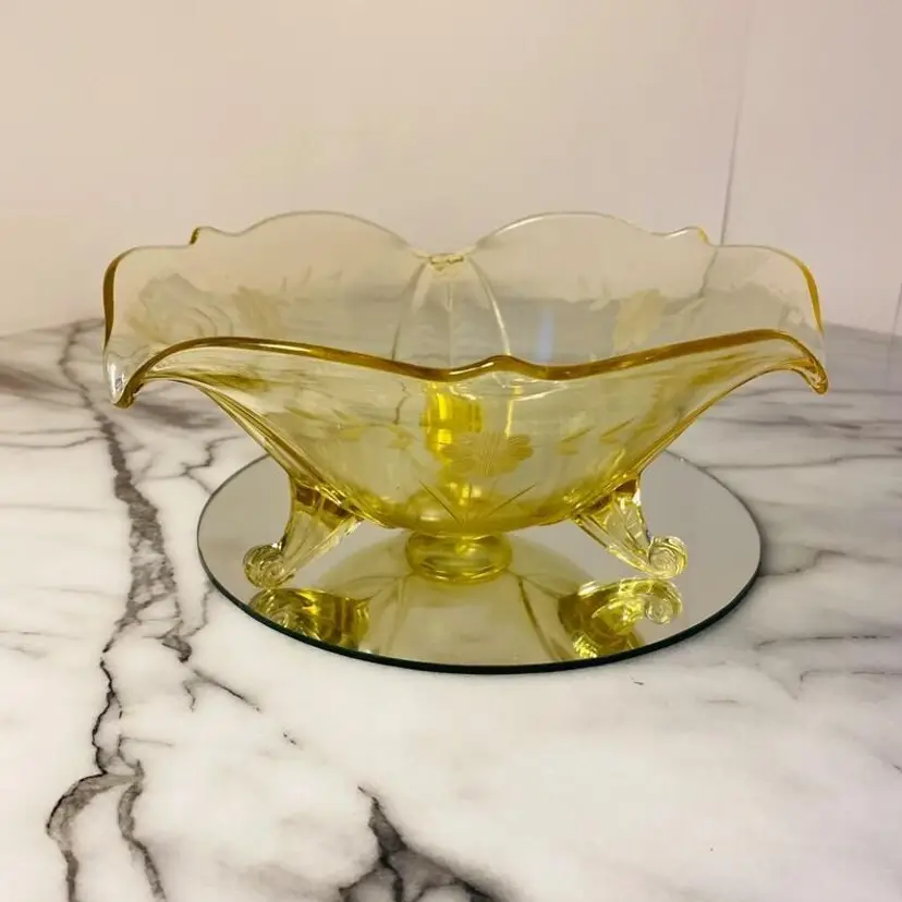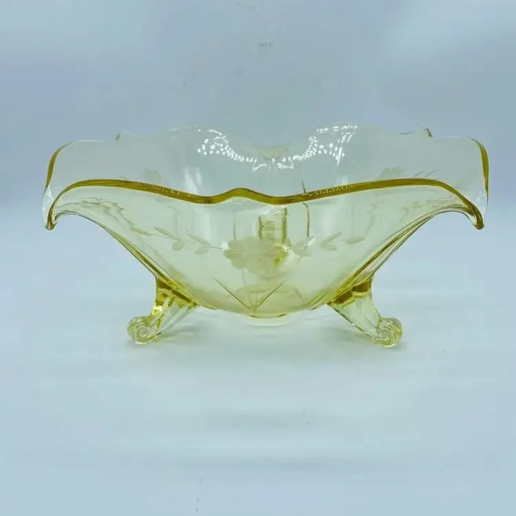 Vintage Lancaster Glass 3-Footed Bowl Petal Pattern Topaz Elegant Glass 8.5" -Beautiful bowl stands on 3 toes, formed into a tight curl -Graceful arch with fine, scalloped detail around the rim -Clear pale yellow topaz -Petal pattern -Lancaster Glass operated from 1908-1937 -Lancaster was known for Elegant Glass, -Condition is excellent, not a chip or a flea bite -Measures 8-1/2" wide, 3" deep and is 3-3/4" tall -Circa the 1930's
