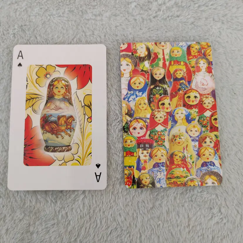 1 Single Swap Card - Playing Card. Babushka Matryoshka doll cards. Each card has a different nesting doll design. Ace of Spades. Dimension 2.5 x 3.5. Read description.